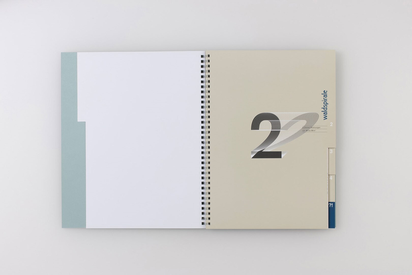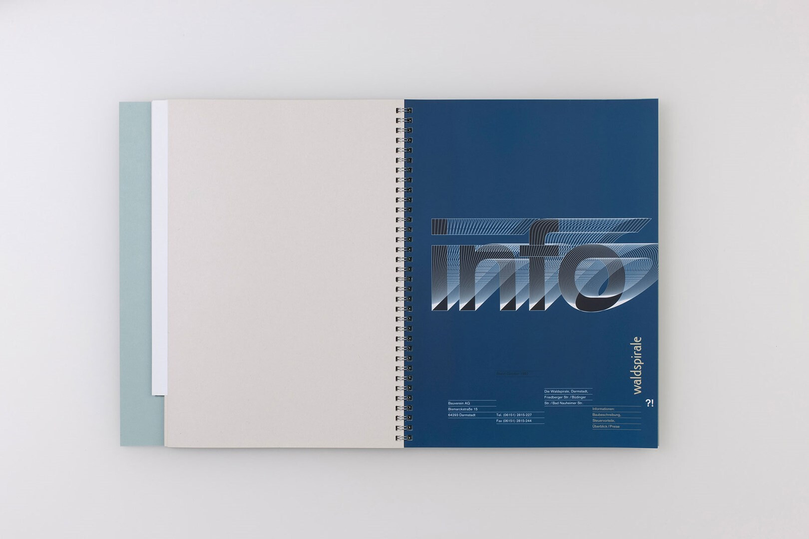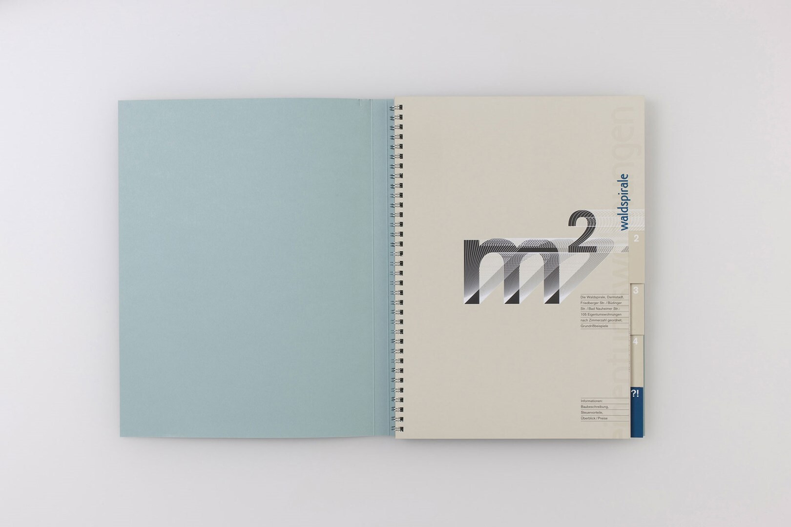 die »waldspirale« von friedensreich hundertwasser wurde im jahr 2000 in darmstadt fertiggestellt. für die vermarktung der eigentumswohnungen entsteht ein verkaufsprospekt, der die eigenwillige topograpie von gebäude und umgebung mit der sachlichkeit der zahlen vereint. 1999