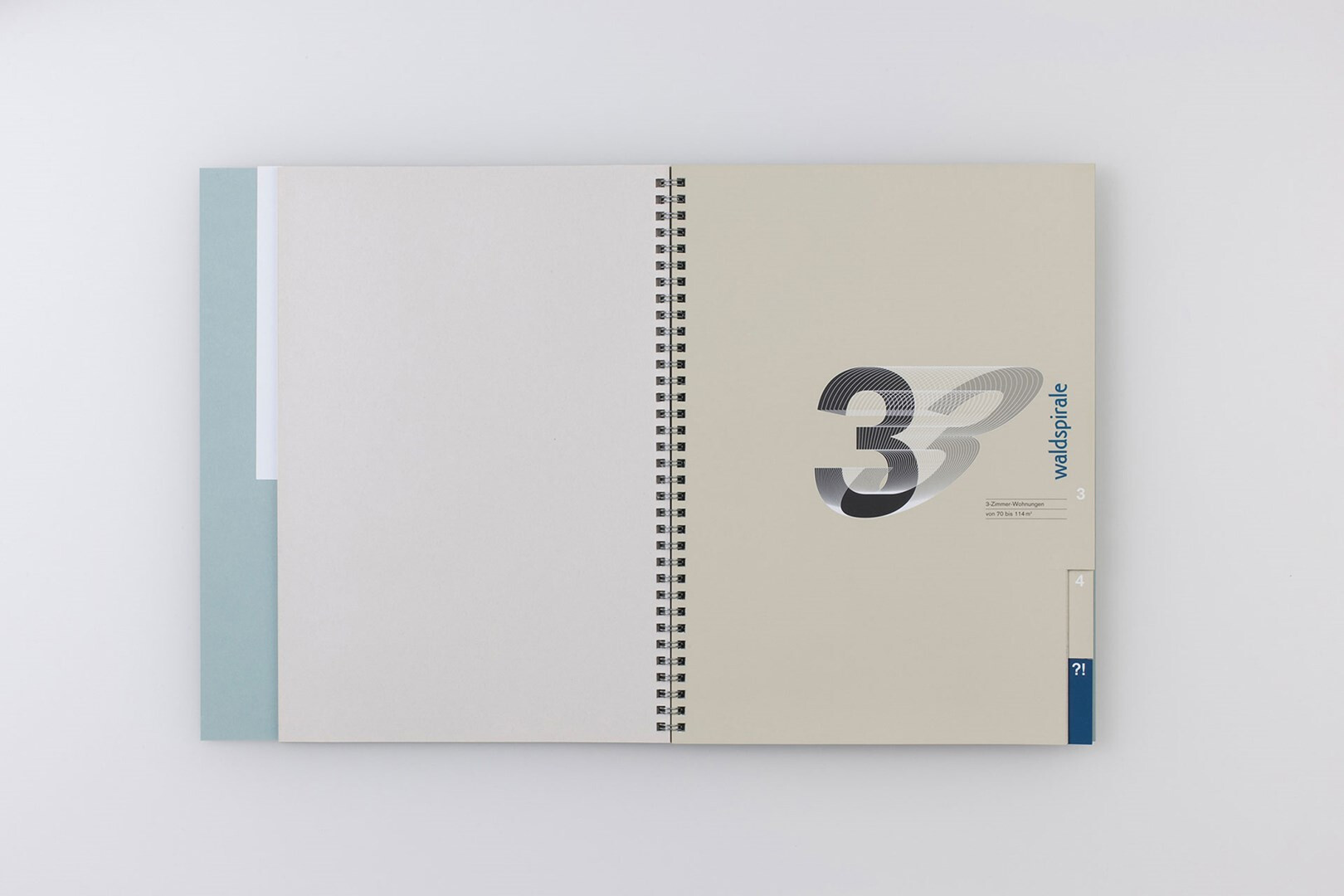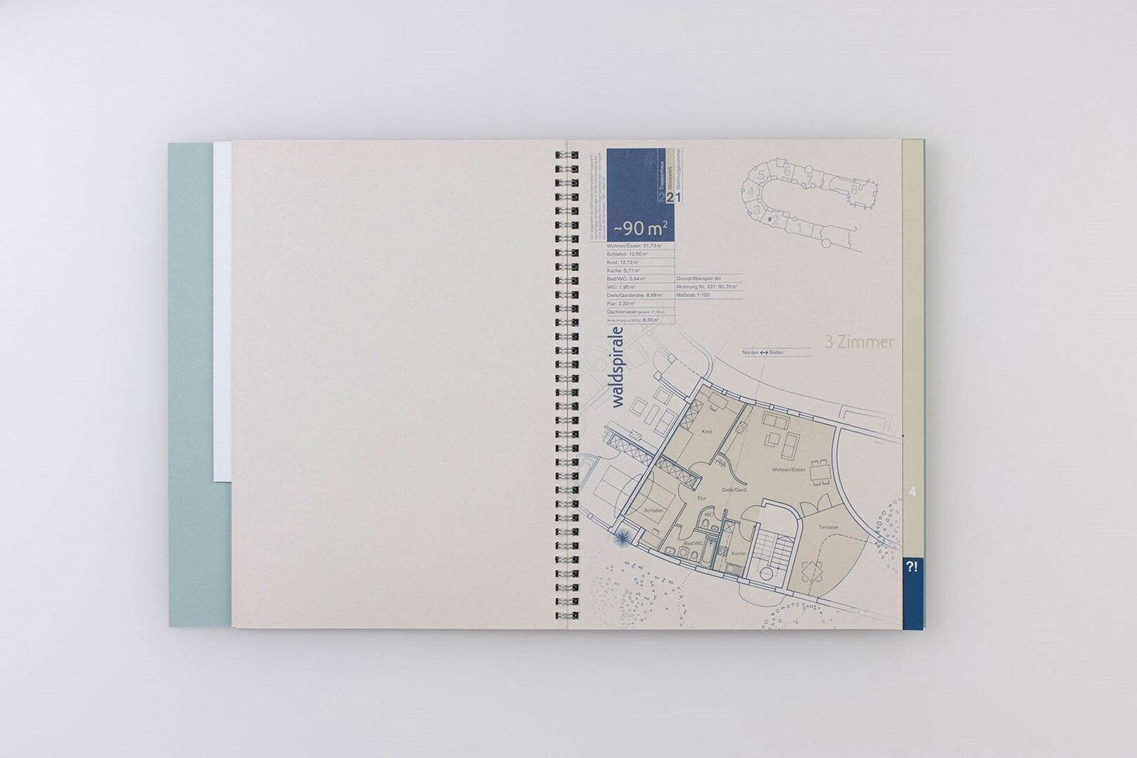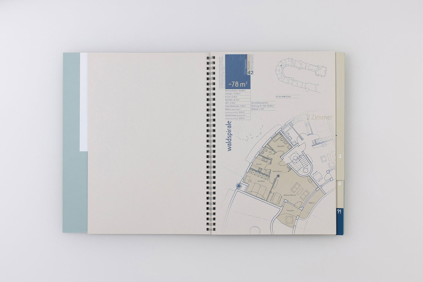 die »waldspirale« von friedensreich hundertwasser wurde im jahr 2000 in darmstadt fertiggestellt. für die vermarktung der eigentumswohnungen entsteht ein verkaufsprospekt, der die eigenwillige topograpie von gebäude und umgebung mit der sachlichkeit der zahlen vereint. 1999