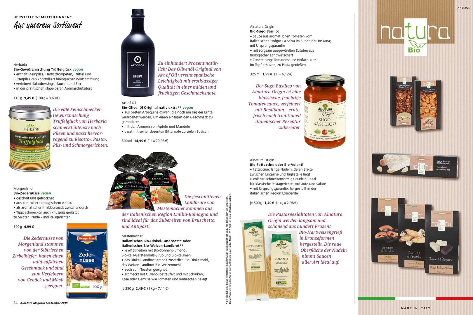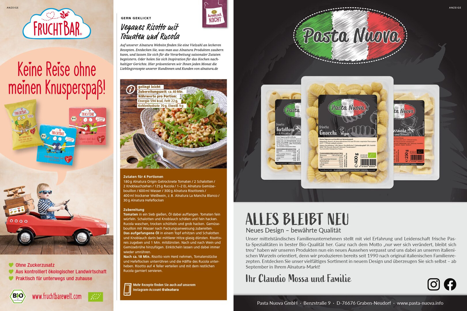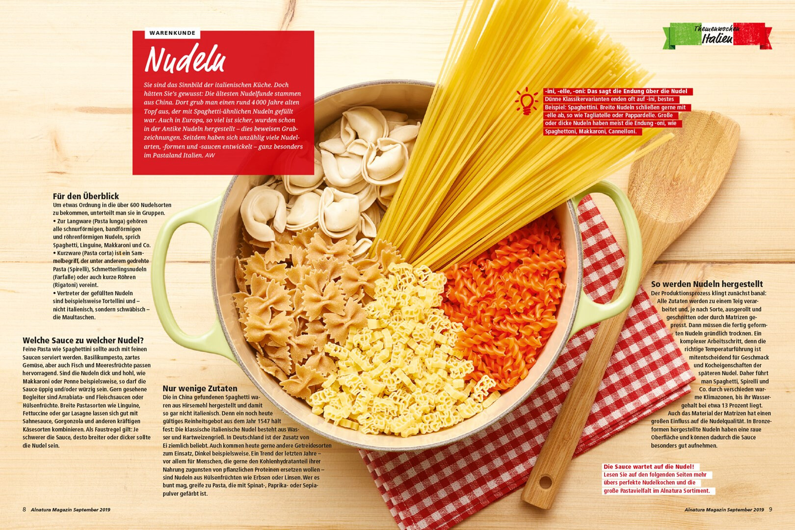 das »italien«-spezial erhält eine klar italienische und genussfreudige ästhetik. mit dem relaunch 2018 verpasste usus dem kundenmagazin ein großzügigeres layout und verschlankte typografie. auf 52 seiten publiziert alnatura aktuelle angebote und redaktionelle beiträge mit einblicken in sein unternehmen sowie zu gesellschaftlich relevanten themen. verlag und redaktion: mfk corporate publishing gmbh, darmstadt