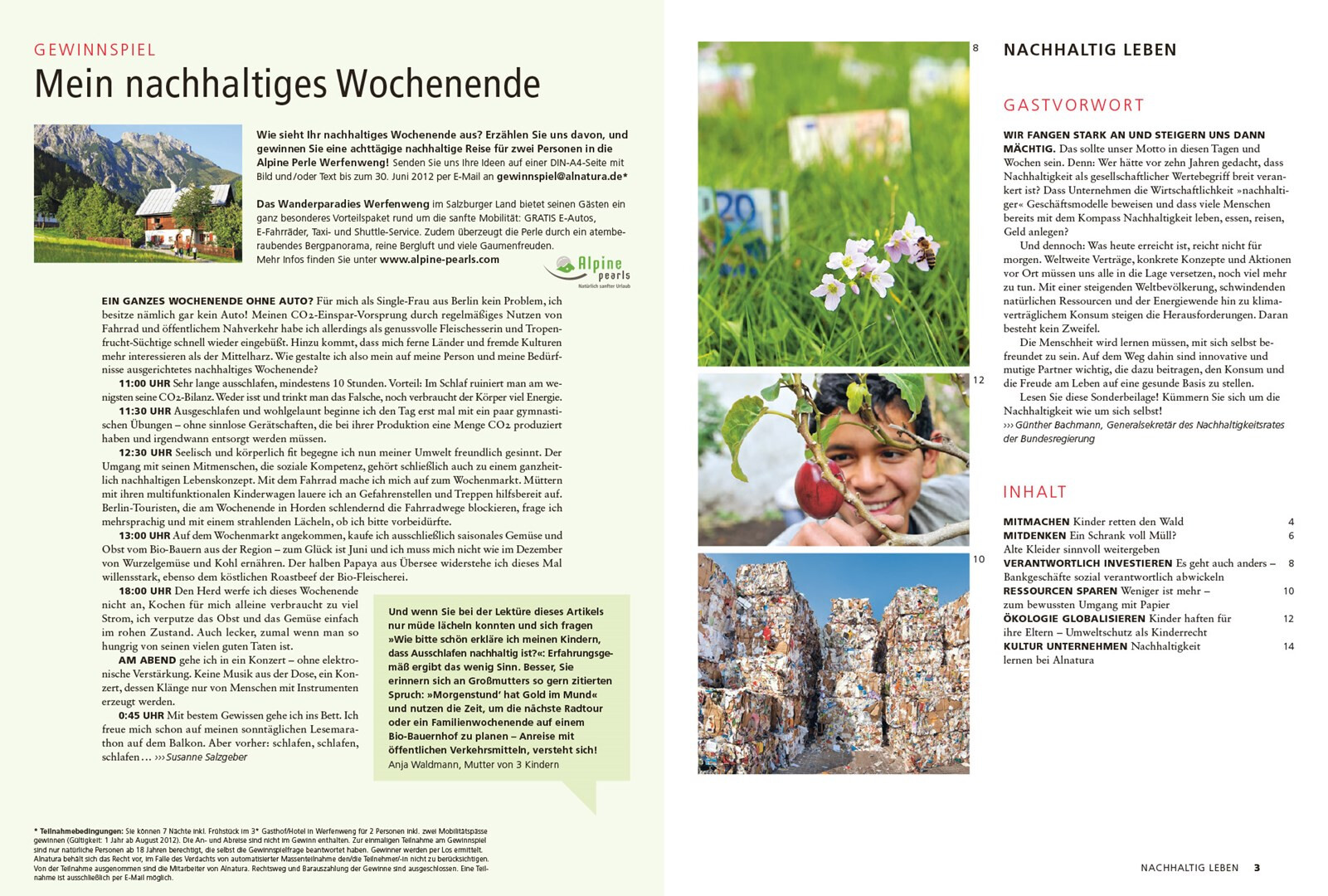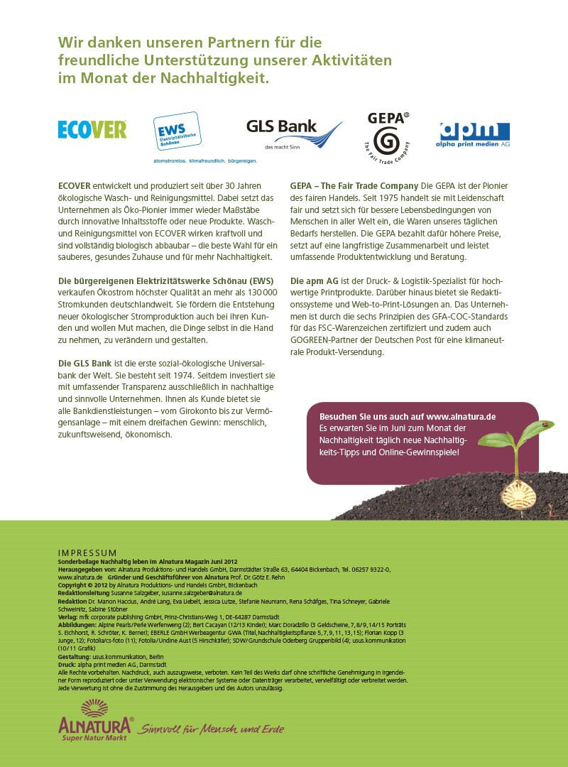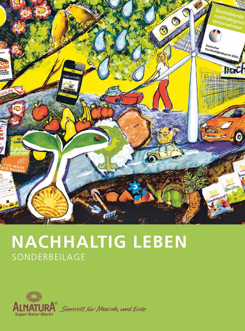 beihefter-gestaltung im rahmen des layouts des alnatura magazins. die ausgabe juni 2012 enthält einen 16-seitigen behefter mit relevanten themen zu nachhaltiger lebensweise. verlag und redaktion: mfk corporate publishing gmbh, darmstadt