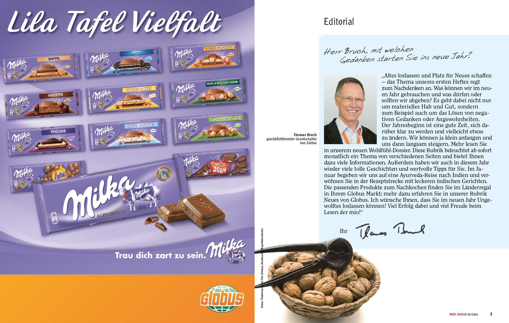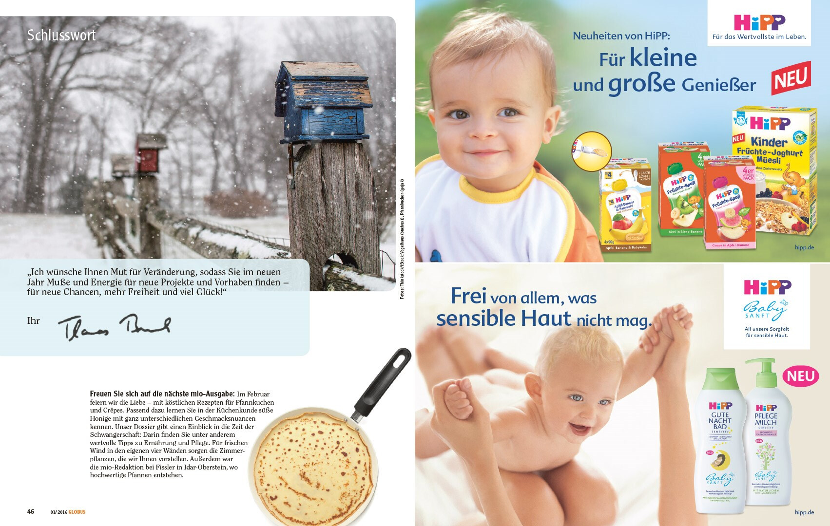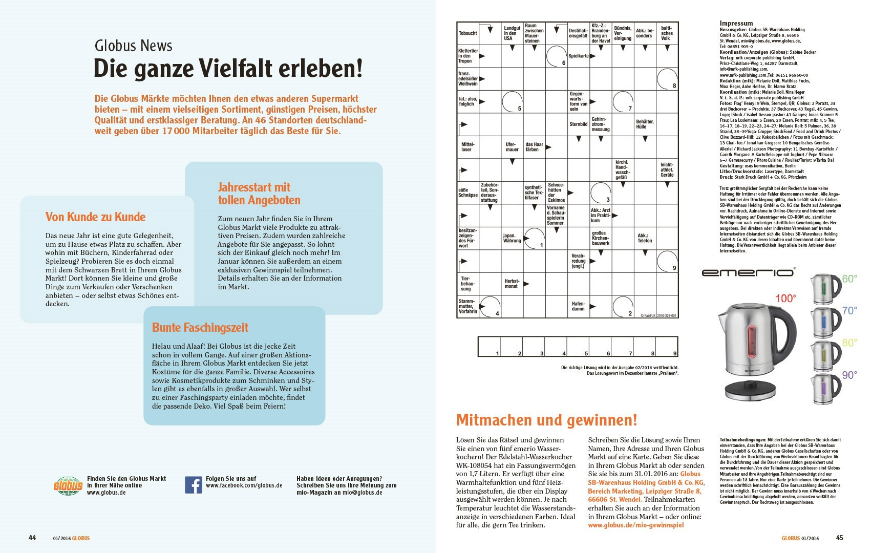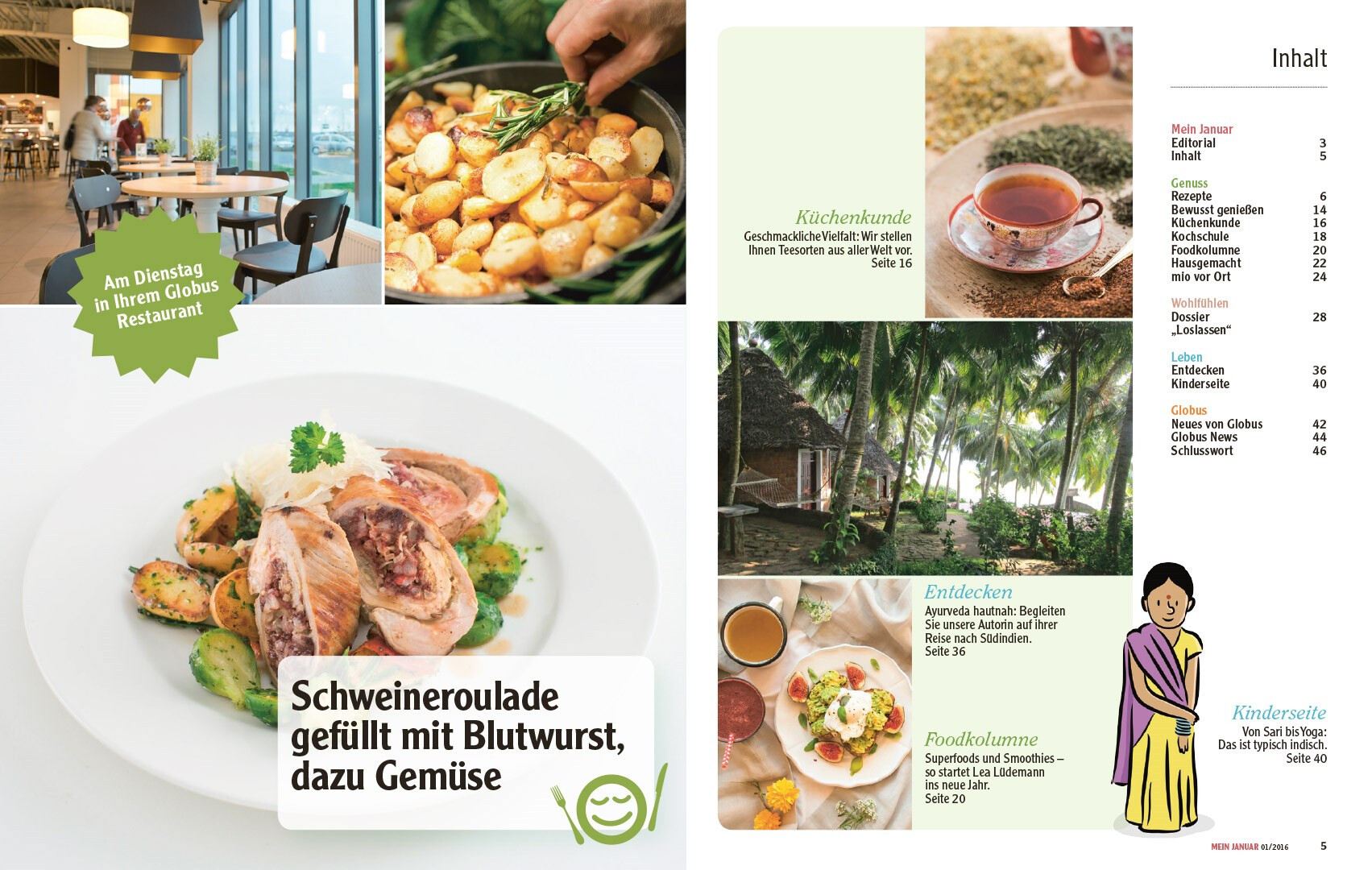 layout des globus corporate-magazins »mio«, ausgabe januar 2016. das kundenmagazin beinhaltet angebote, saisonale rezepte, redaktionelle beiträge zu aktuellen themen und einblicke in das unternehmen. verlag und redaktion: mfk corporate publishing gmbh, darmstadt
