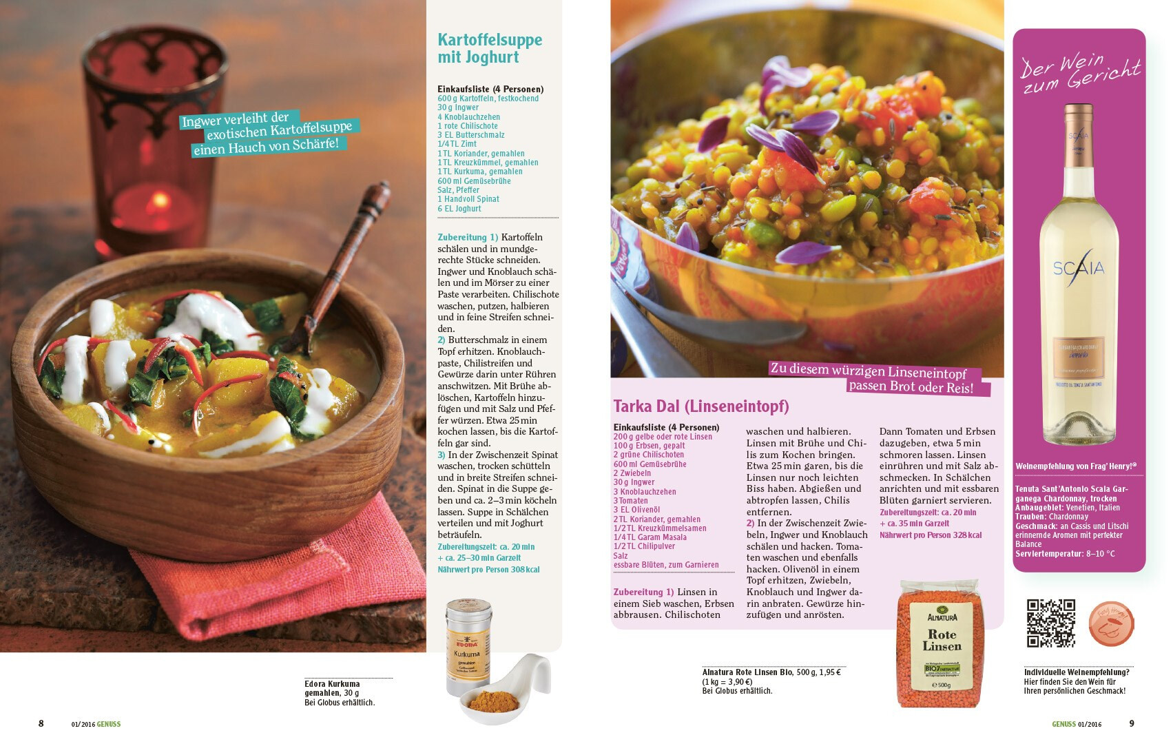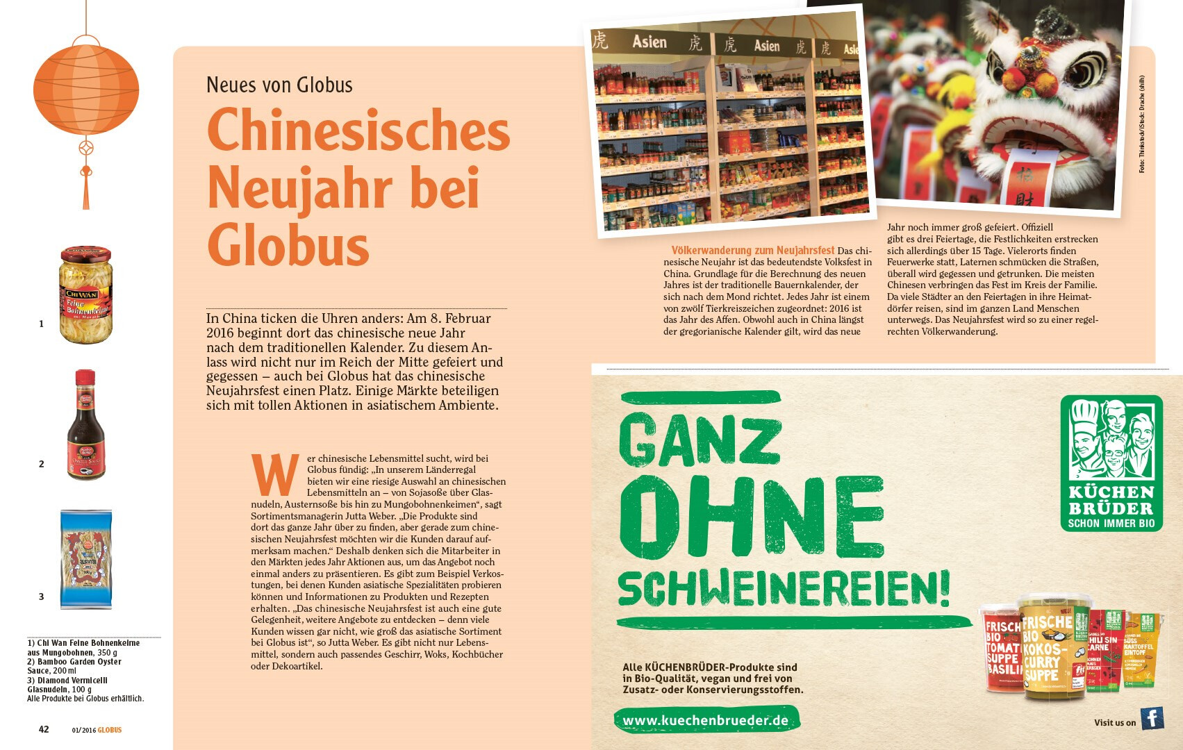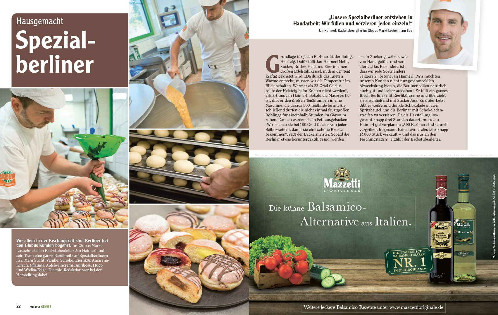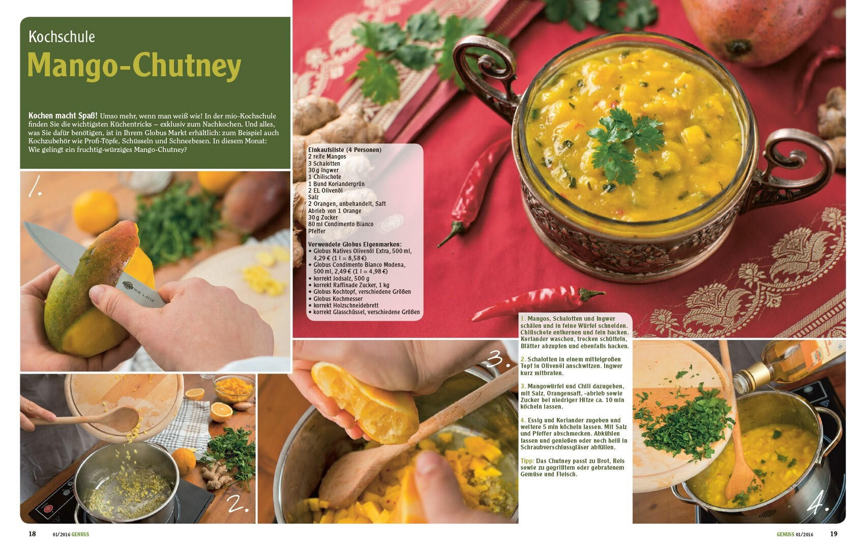 layout des globus corporate-magazins »mio«, ausgabe januar 2016. das kundenmagazin beinhaltet angebote, saisonale rezepte, redaktionelle beiträge zu aktuellen themen und einblicke in das unternehmen. verlag und redaktion: mfk corporate publishing gmbh, darmstadt