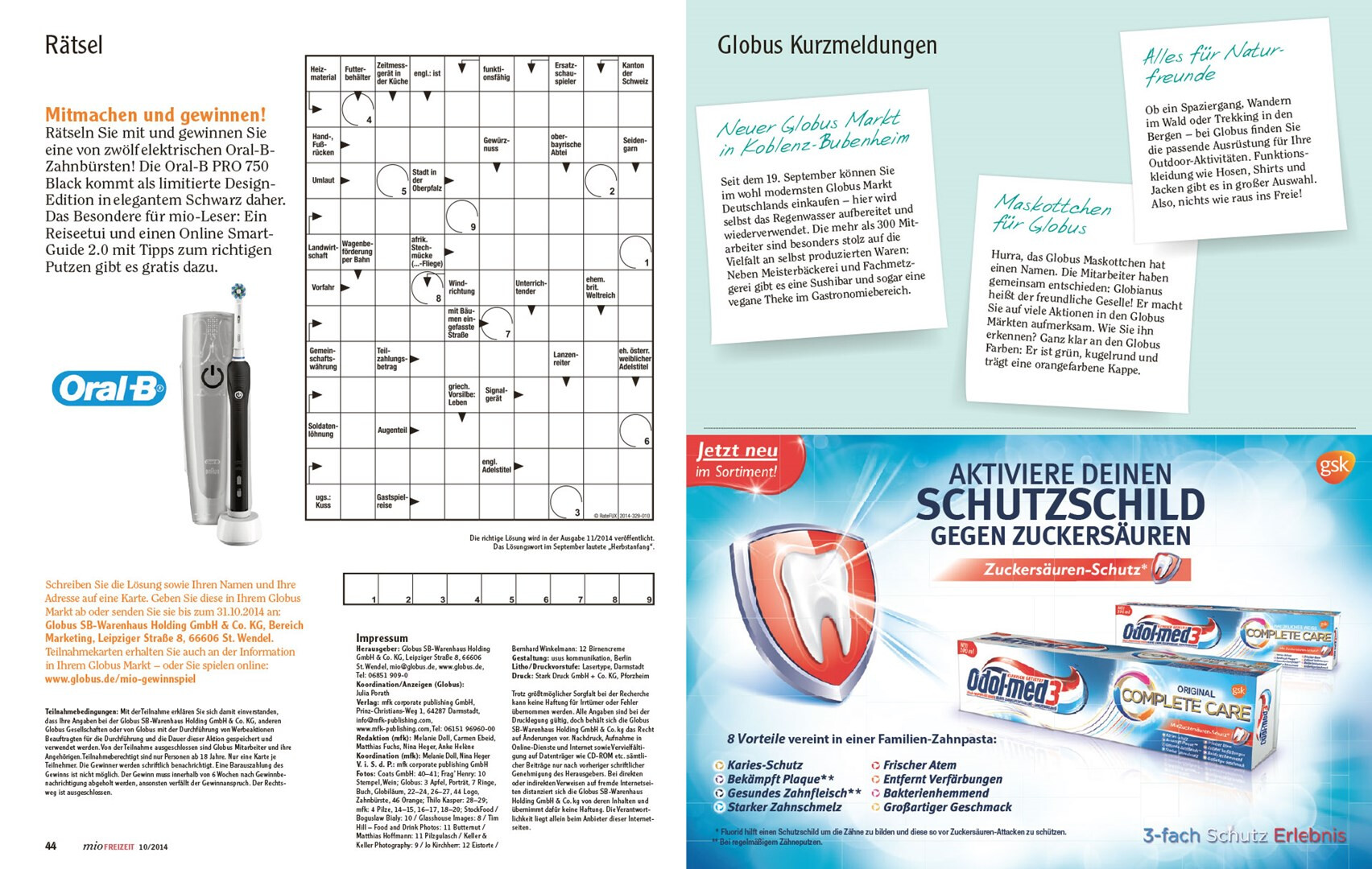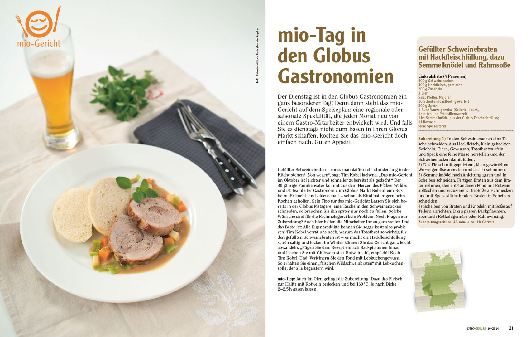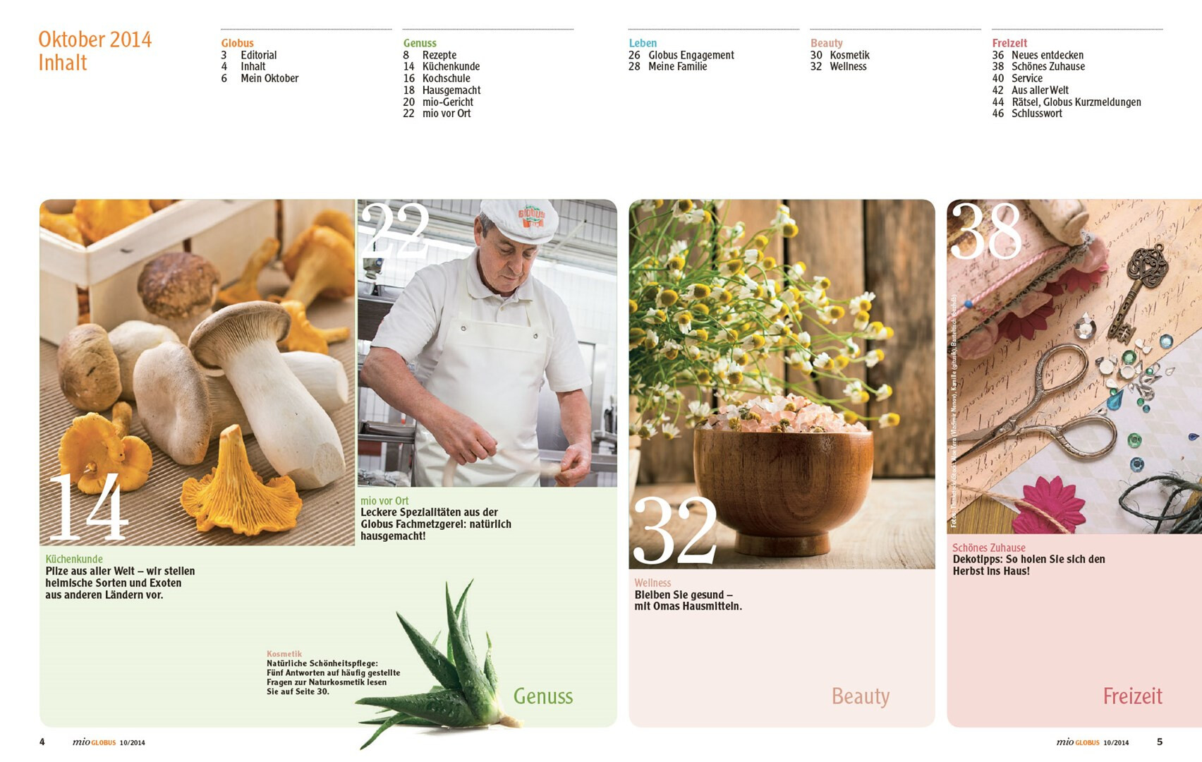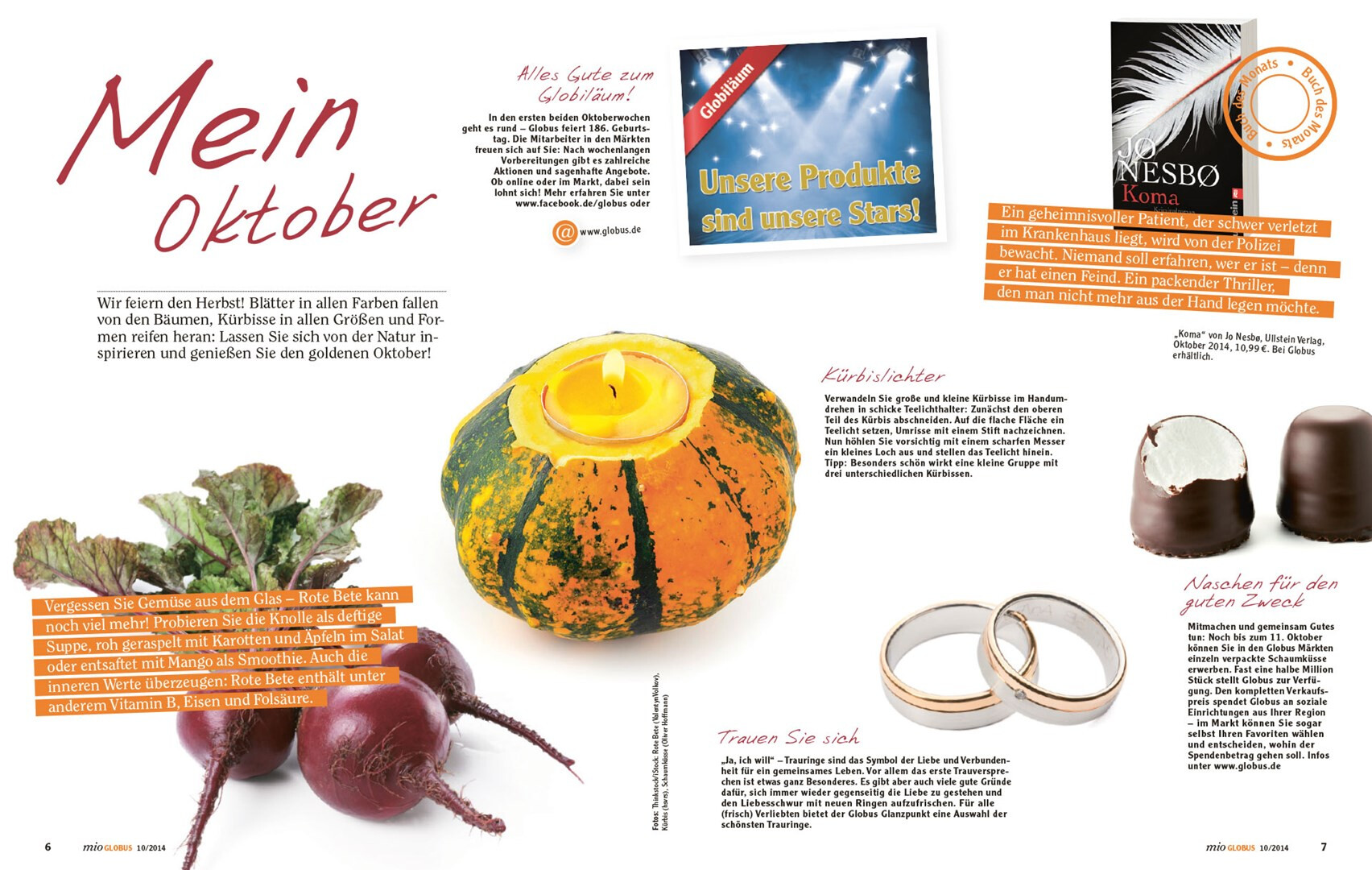 layout des globus corporate-magazins »mio«, ausgabe oktober 2014. das 48-seitige kundenmagazin beinhaltet angebote, saisonale rezepte, redaktionelle beiträge zu aktuellen themen und einblicke in das unternehmen. verlag und redaktion: mfk corporate publishing gmbh, darmstadt