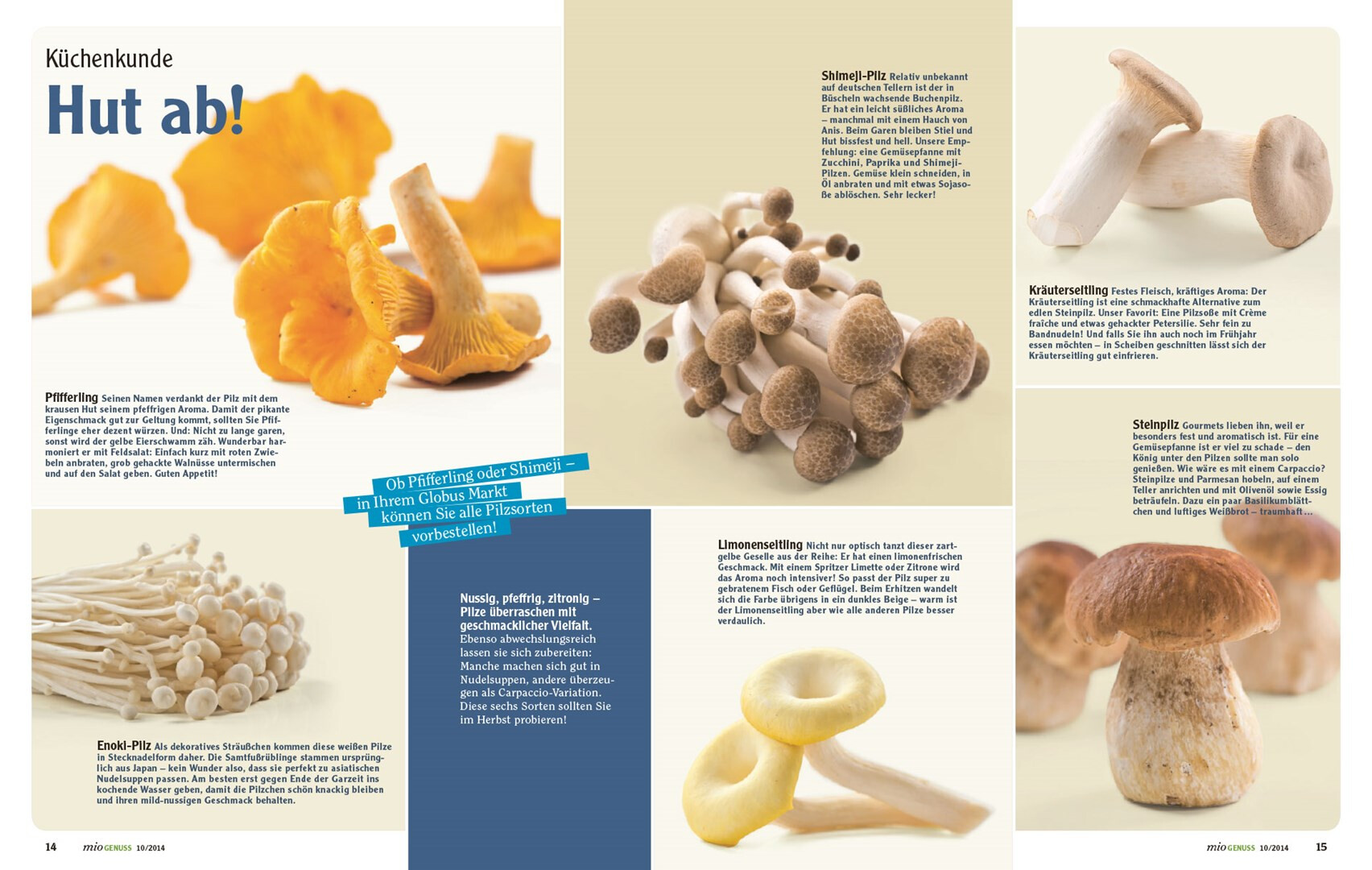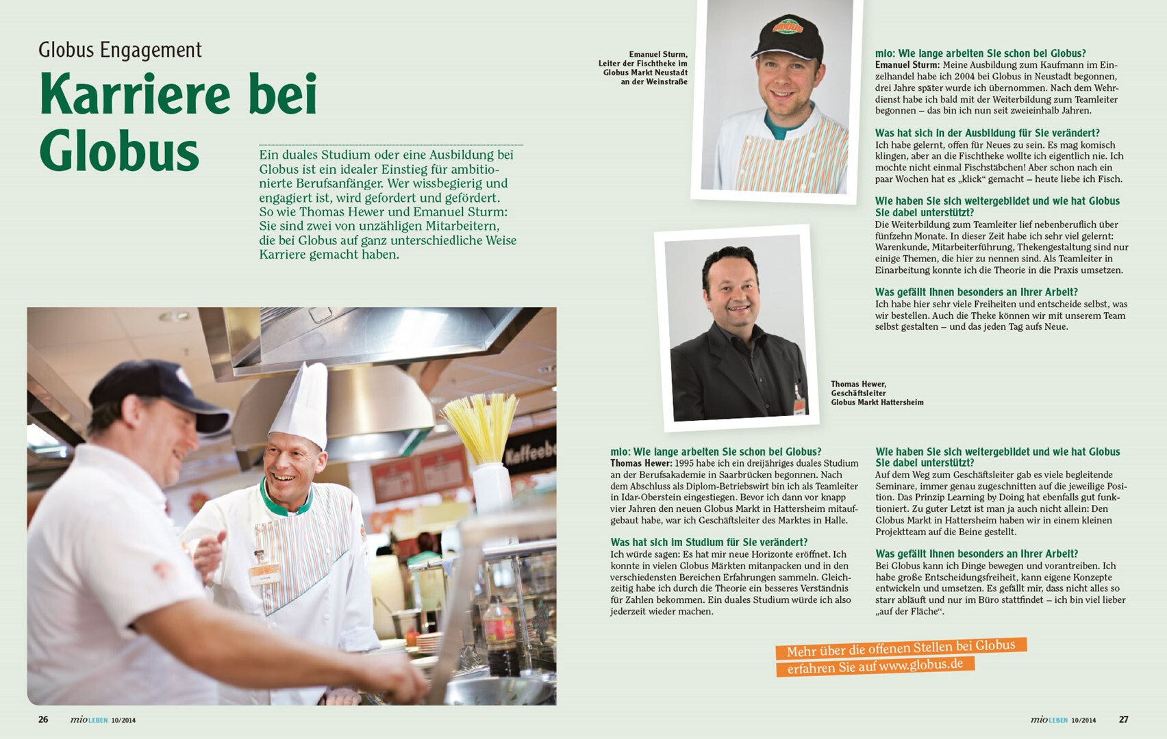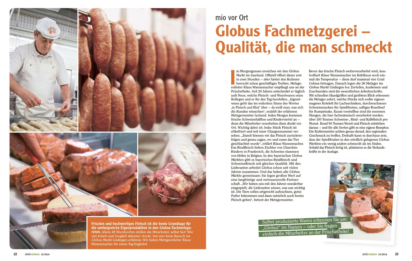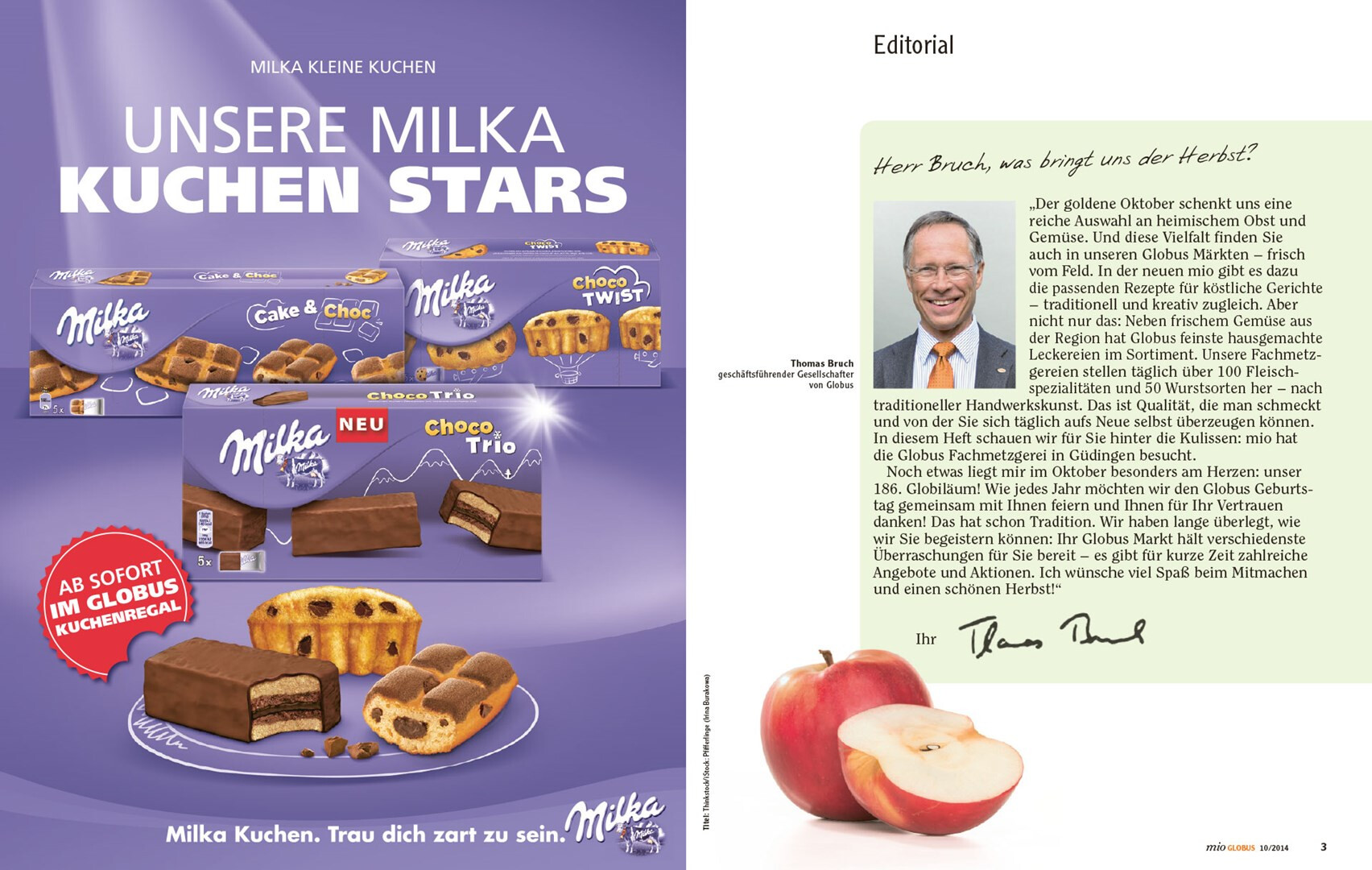 layout des globus corporate-magazins »mio«, ausgabe oktober 2014. das 48-seitige kundenmagazin beinhaltet angebote, saisonale rezepte, redaktionelle beiträge zu aktuellen themen und einblicke in das unternehmen. verlag und redaktion: mfk corporate publishing gmbh, darmstadt