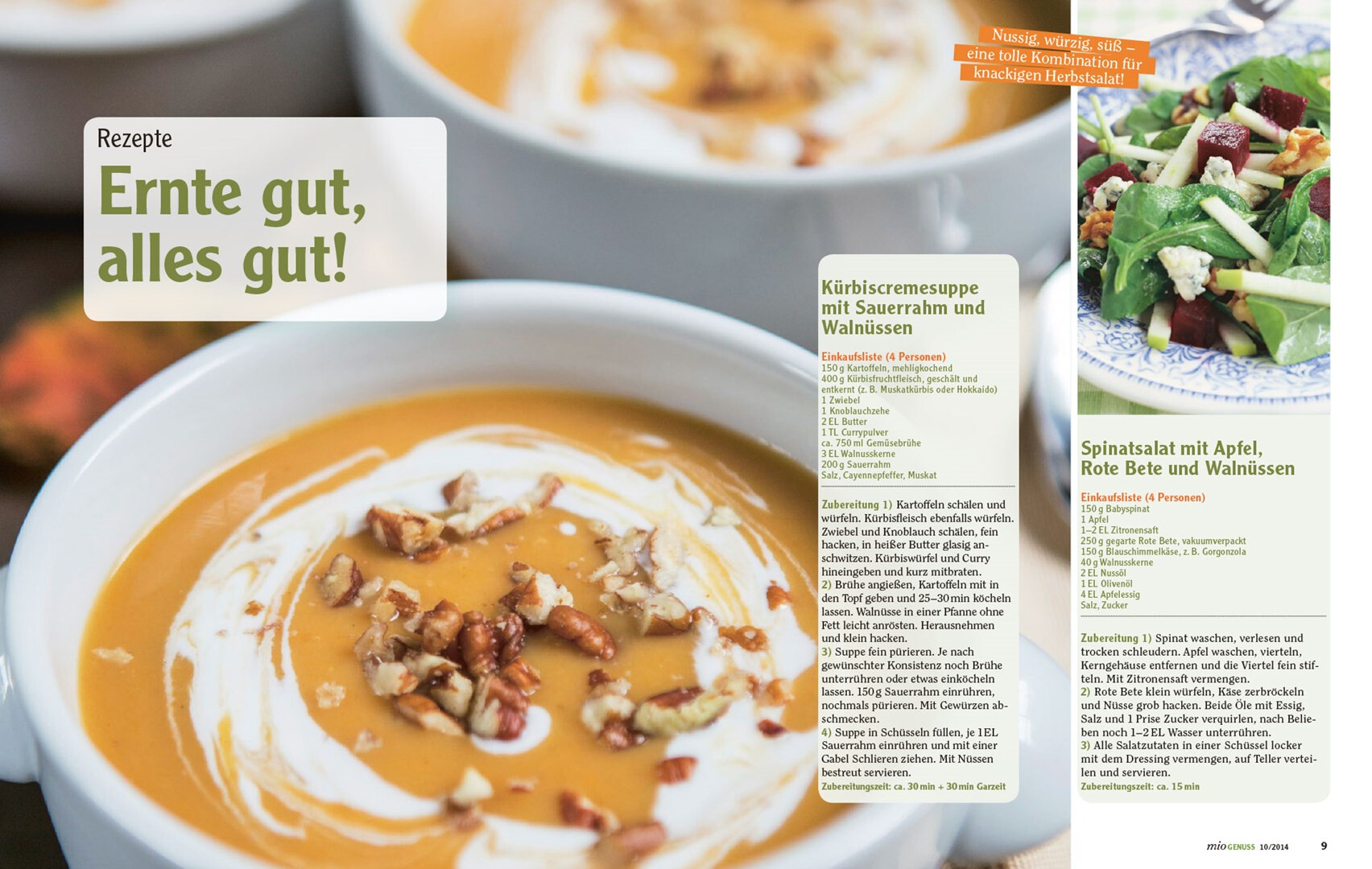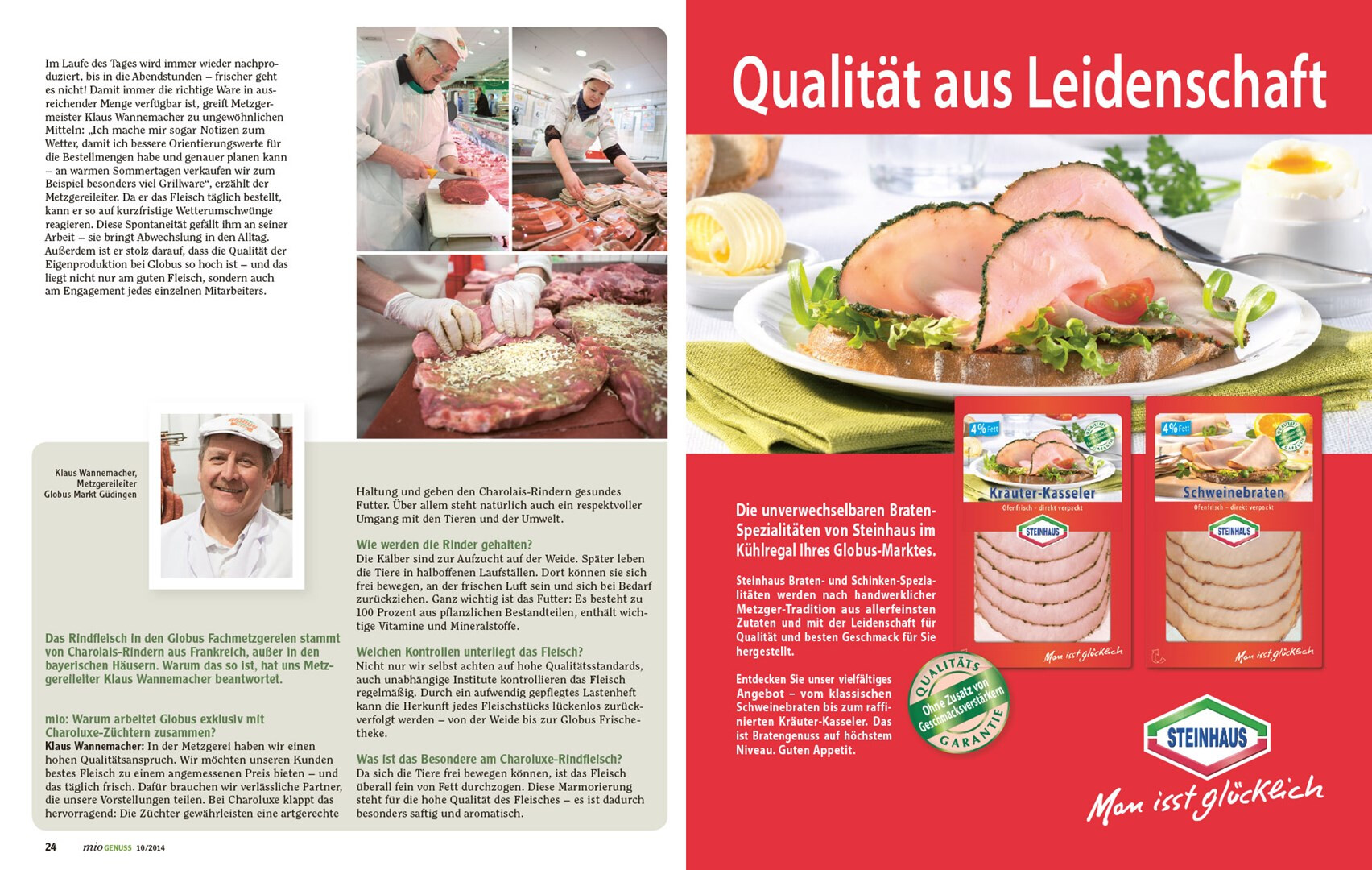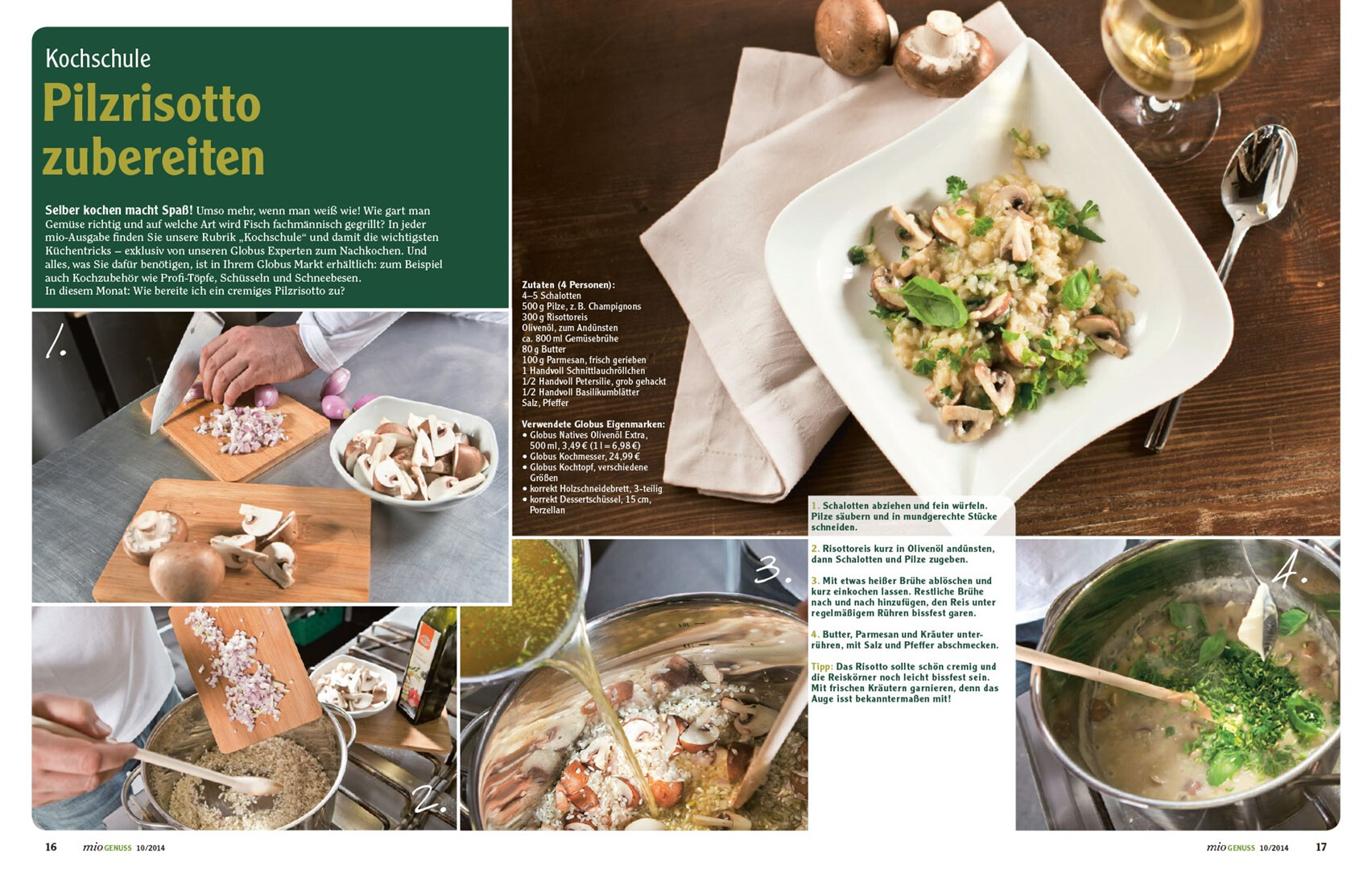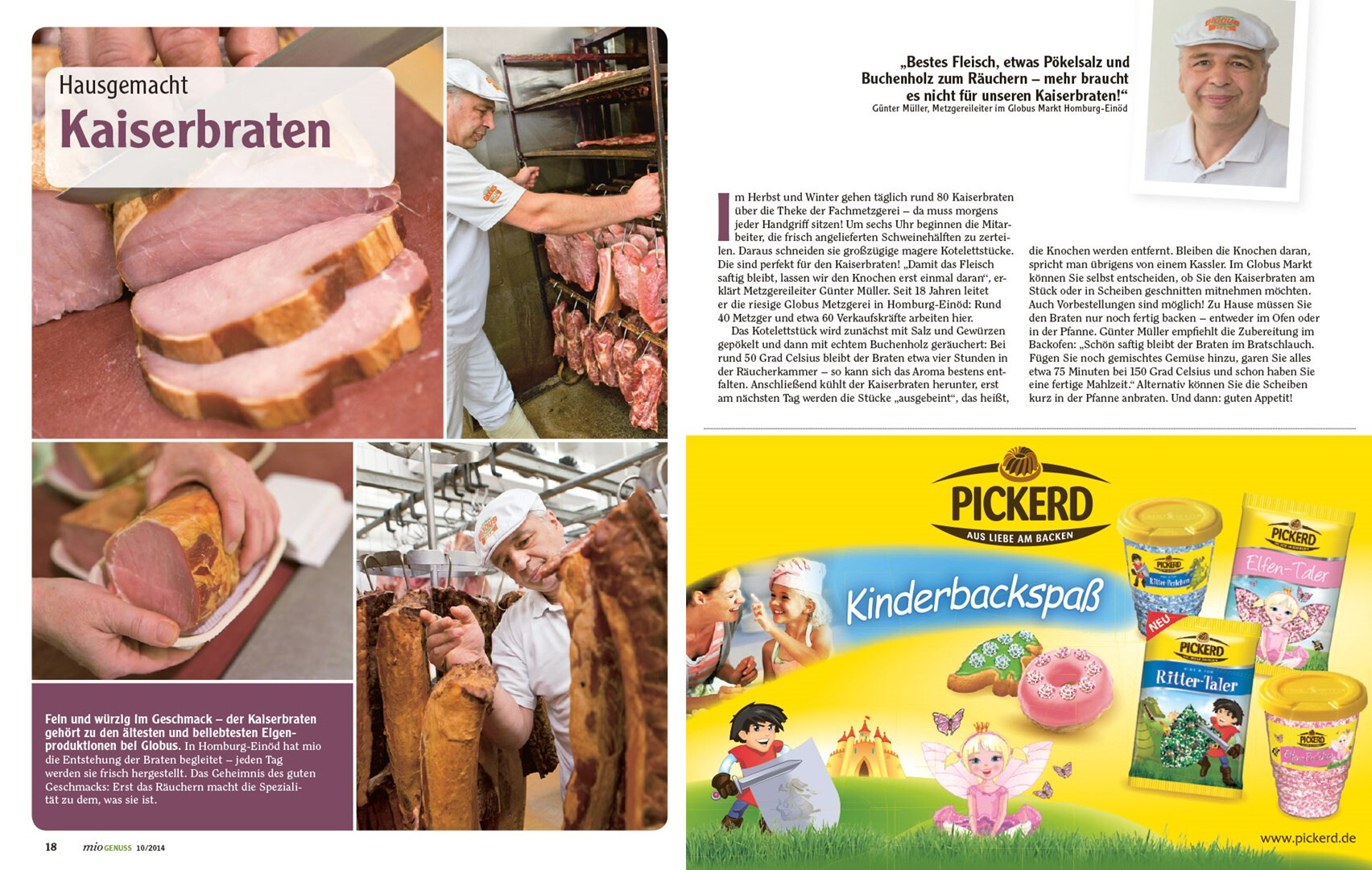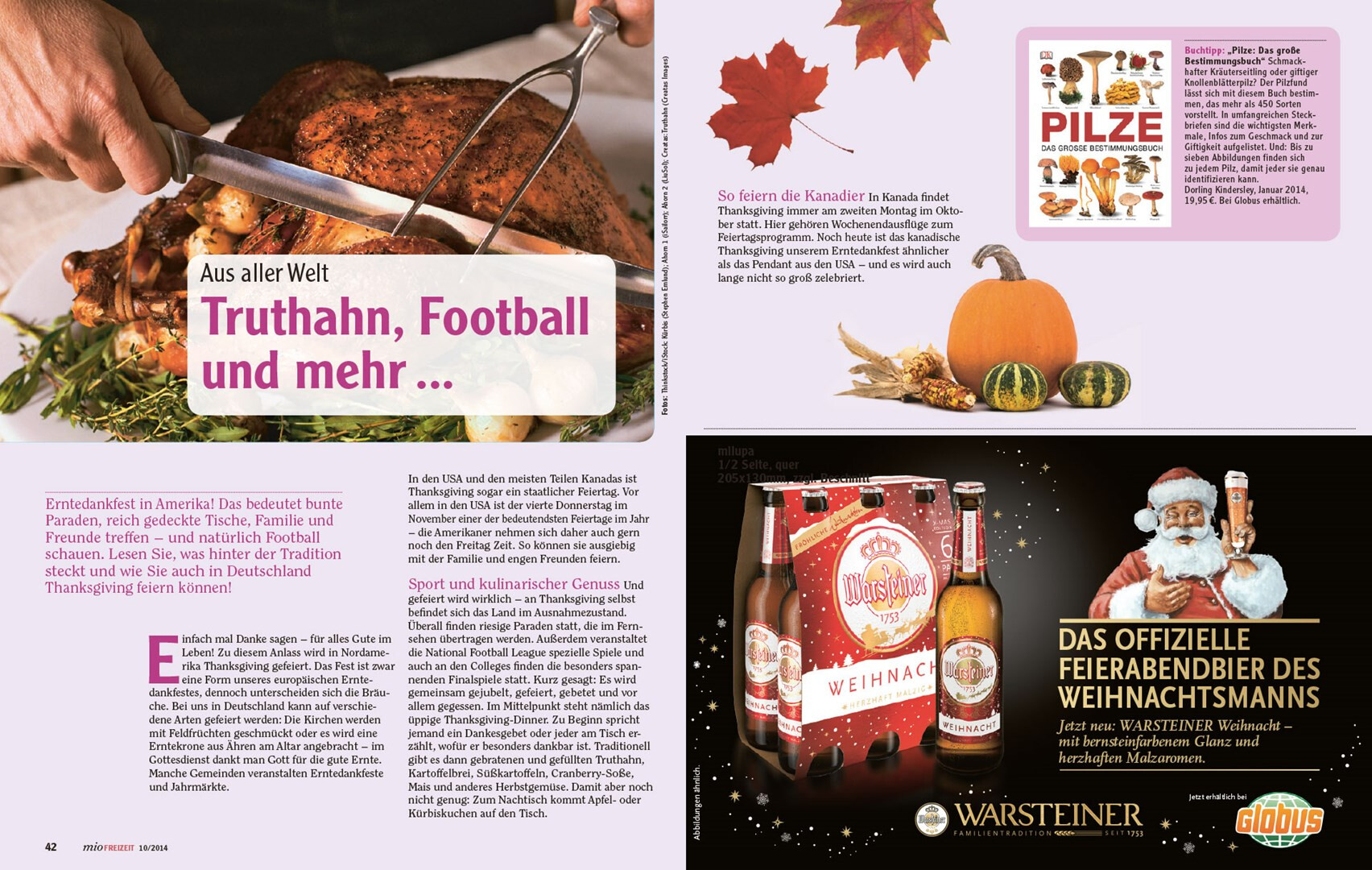 layout des globus corporate-magazins »mio«, ausgabe oktober 2014. das 48-seitige kundenmagazin beinhaltet angebote, saisonale rezepte, redaktionelle beiträge zu aktuellen themen und einblicke in das unternehmen. verlag und redaktion: mfk corporate publishing gmbh, darmstadt
