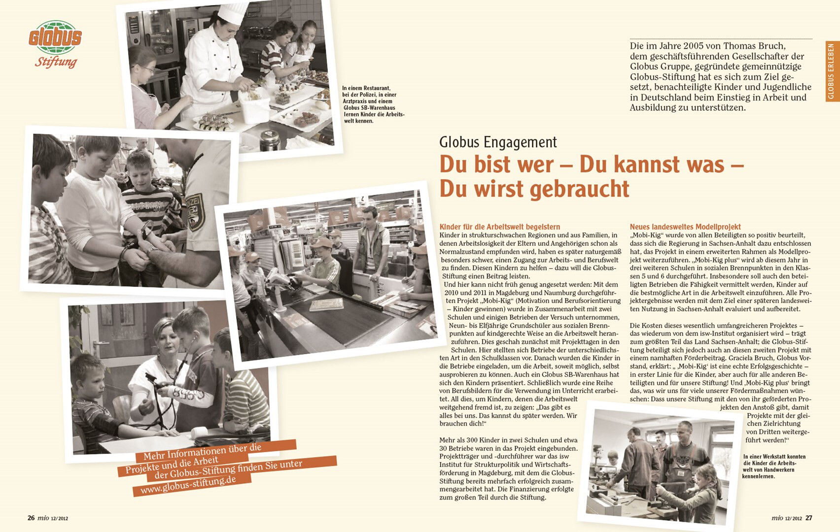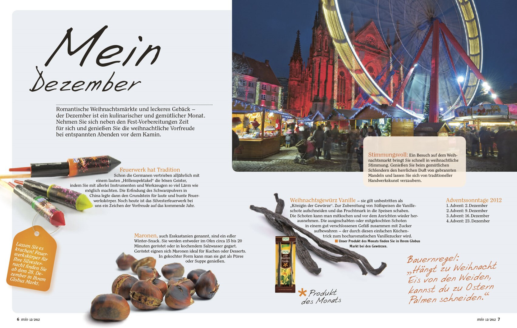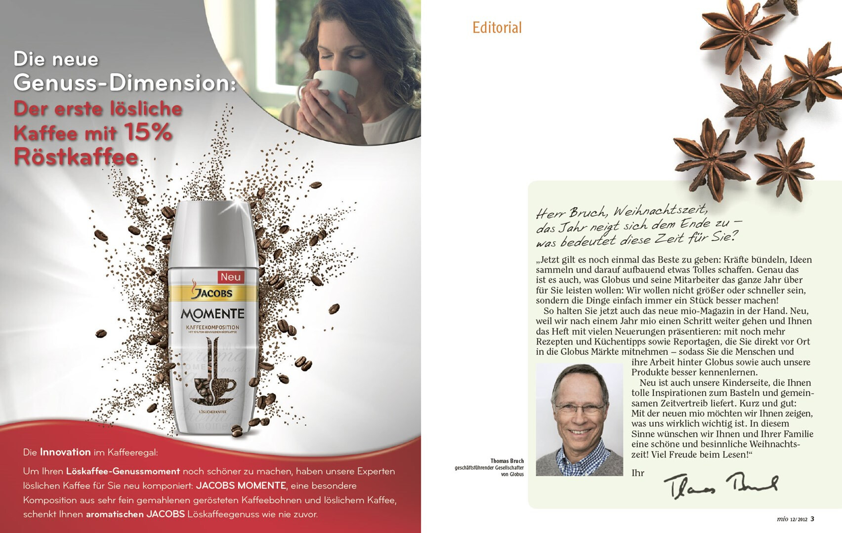 relaunch des globus corporate-magazins »mio«. das 48-seitige kundenmagazin beinhaltet angebote, saisonale rezepte, redaktionelle beiträge zu aktuellen themen und einblicke in das unternehmen. usus konzipiert struktur und design der »mio« neu, im dezember 2012 erscheint die erste ausgabe im veränderten gewand mit weihnachtsbeihefter. verlag und redaktion: mfk corporate publishing gmbh, darmstadt