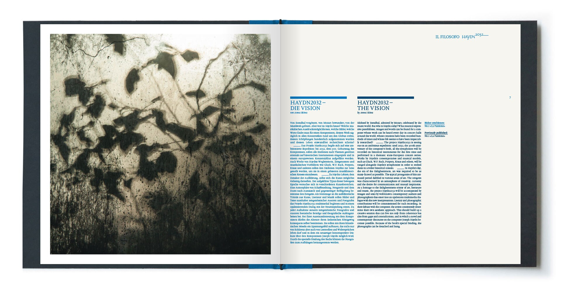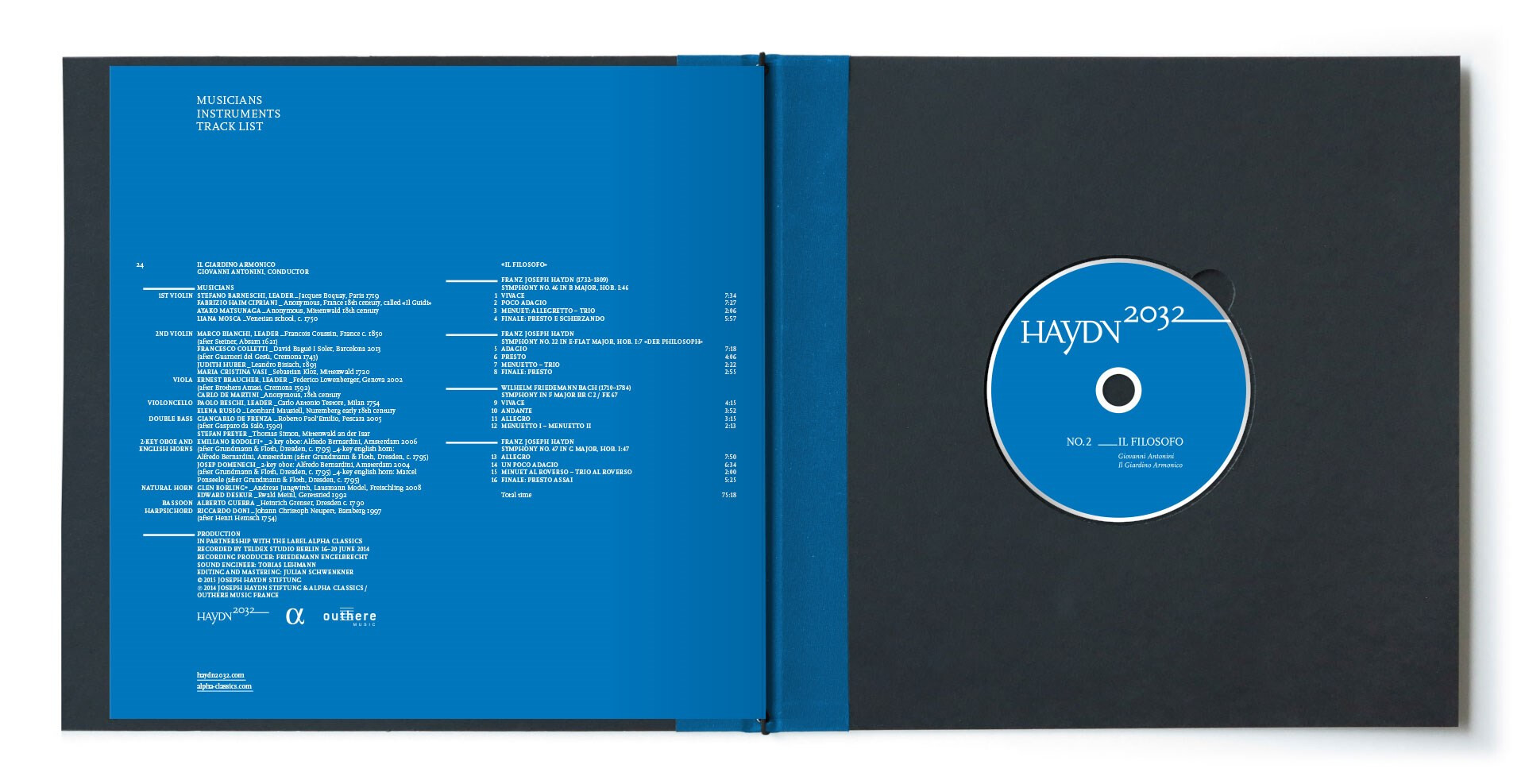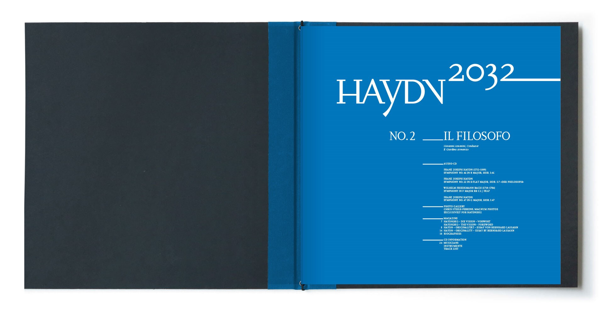 entwicklung einer hard-cover-mappe als corporate-flagschiff. in dem projekt haydn2032 werden alle 108 haydn-sinfonien bis 2032 neu eingespielt und erscheinen thematisch gegliedert als hochwertige editionen mit essays, interviews und exklusiven fotoserien von renommierten magnum-fotografen. edition no.2 »il filosofo«: mit fotos von chris steele perkins, magnum photos, und essay von bernhard lassahn. 2015
