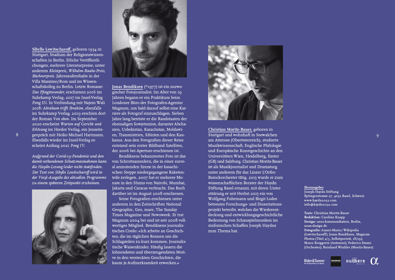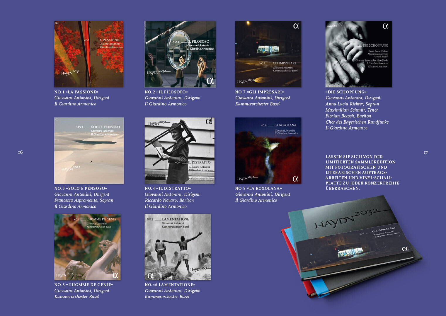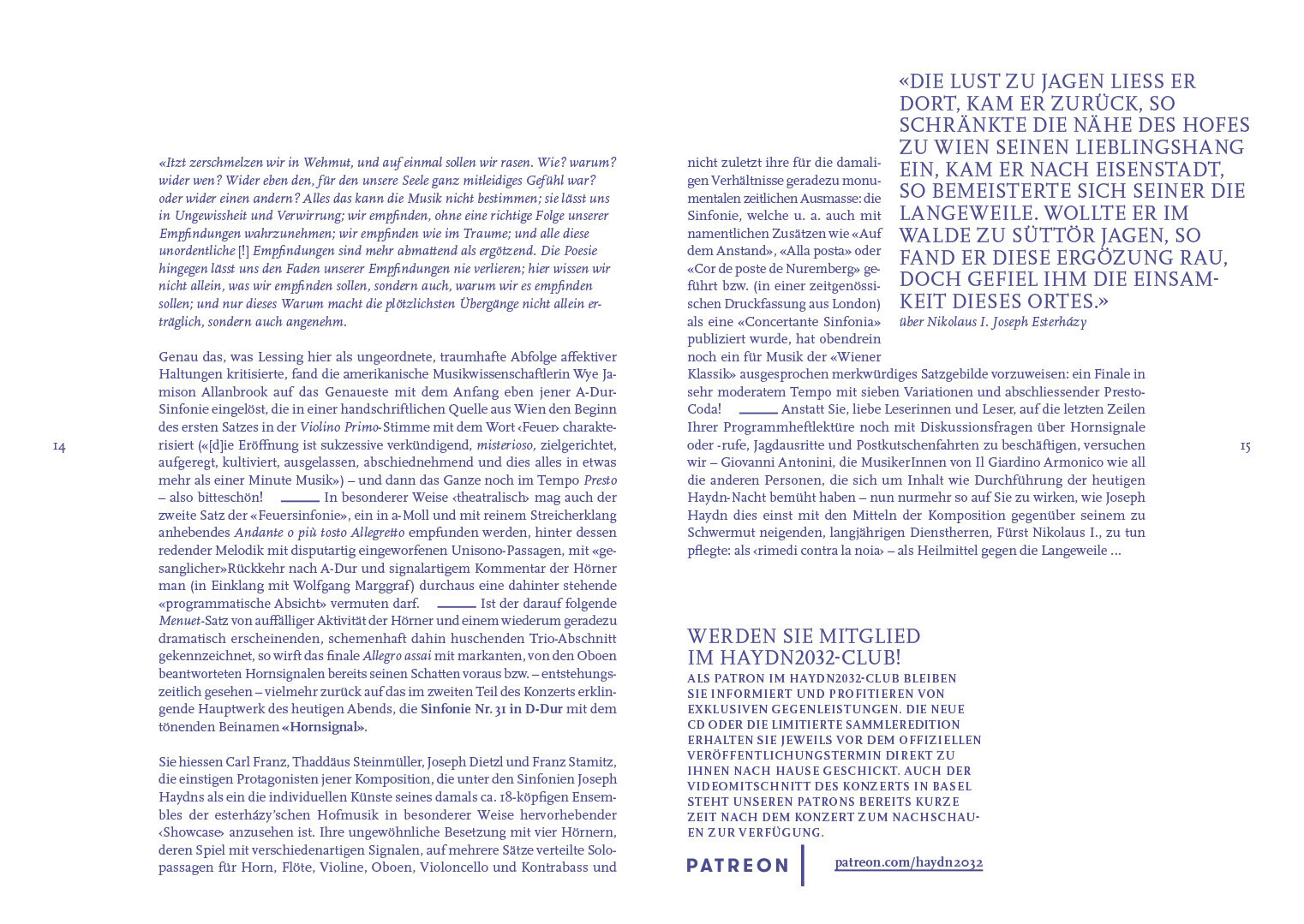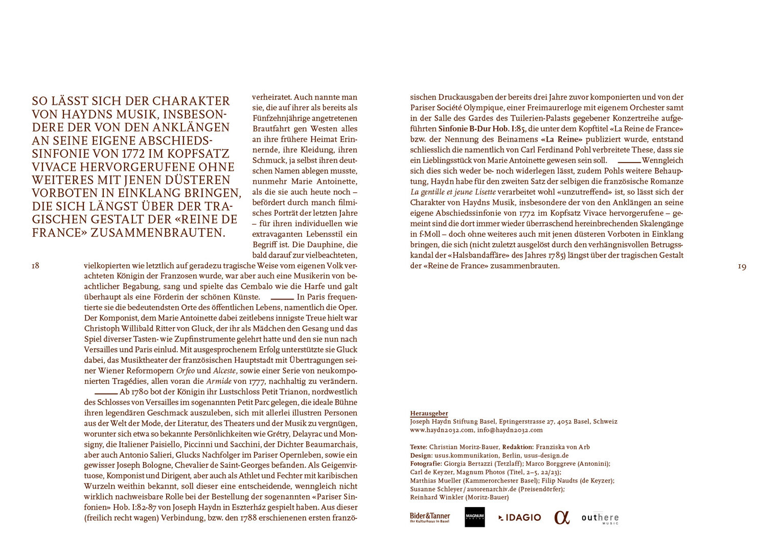 programmhefte im rahmen des corporate designs für das projekt haydn2032. in dem projekt werden alle 108 haydn-sinfonien bis 2032 neu eingespielt und erscheinen thematisch gegliedert als hochwertige editionen mit essays, interviews und exklusiven fotoserien von renommierten magnum-fotografen.