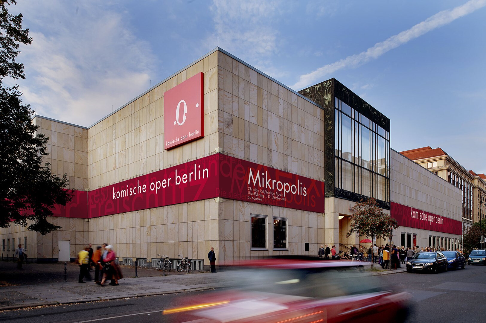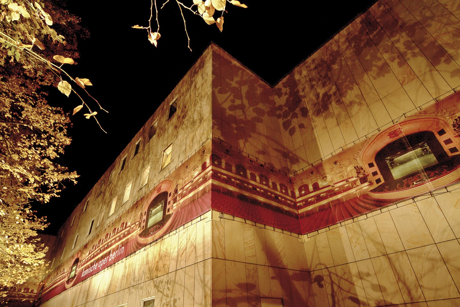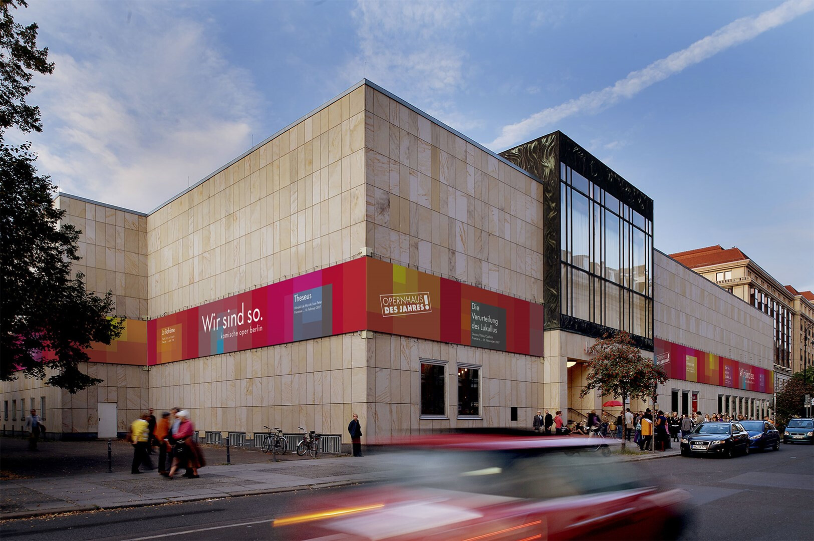 das gebäude der komischen oper berlin ist ein nachkriegskuriosum, zwar unter den linden gelegen, aber mit eingang »hinten« an der behrenstraße. usus konzipiert eine banderole, die die heterogene kubatur des opernhauses zusammenfasst und begreifbar macht. seit der spielzeit 2004/05 wird auf einer gesamtlänge von 250 metern die spielzeit beworben.