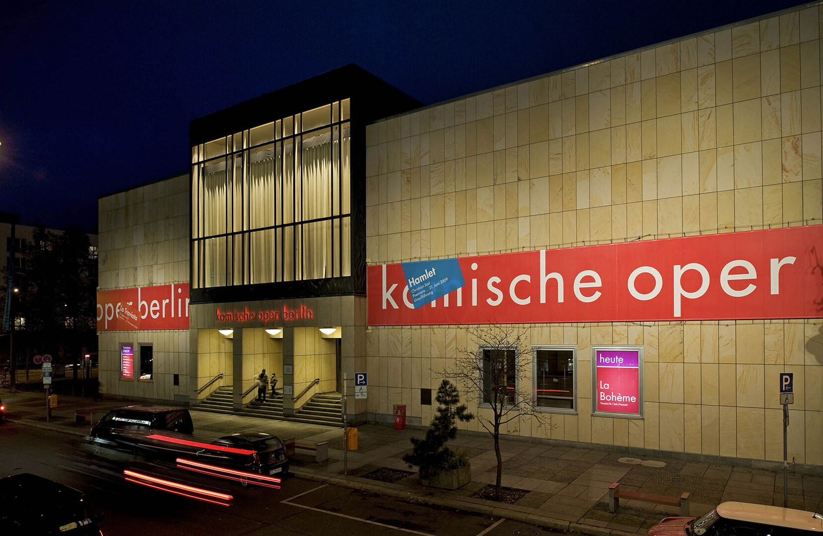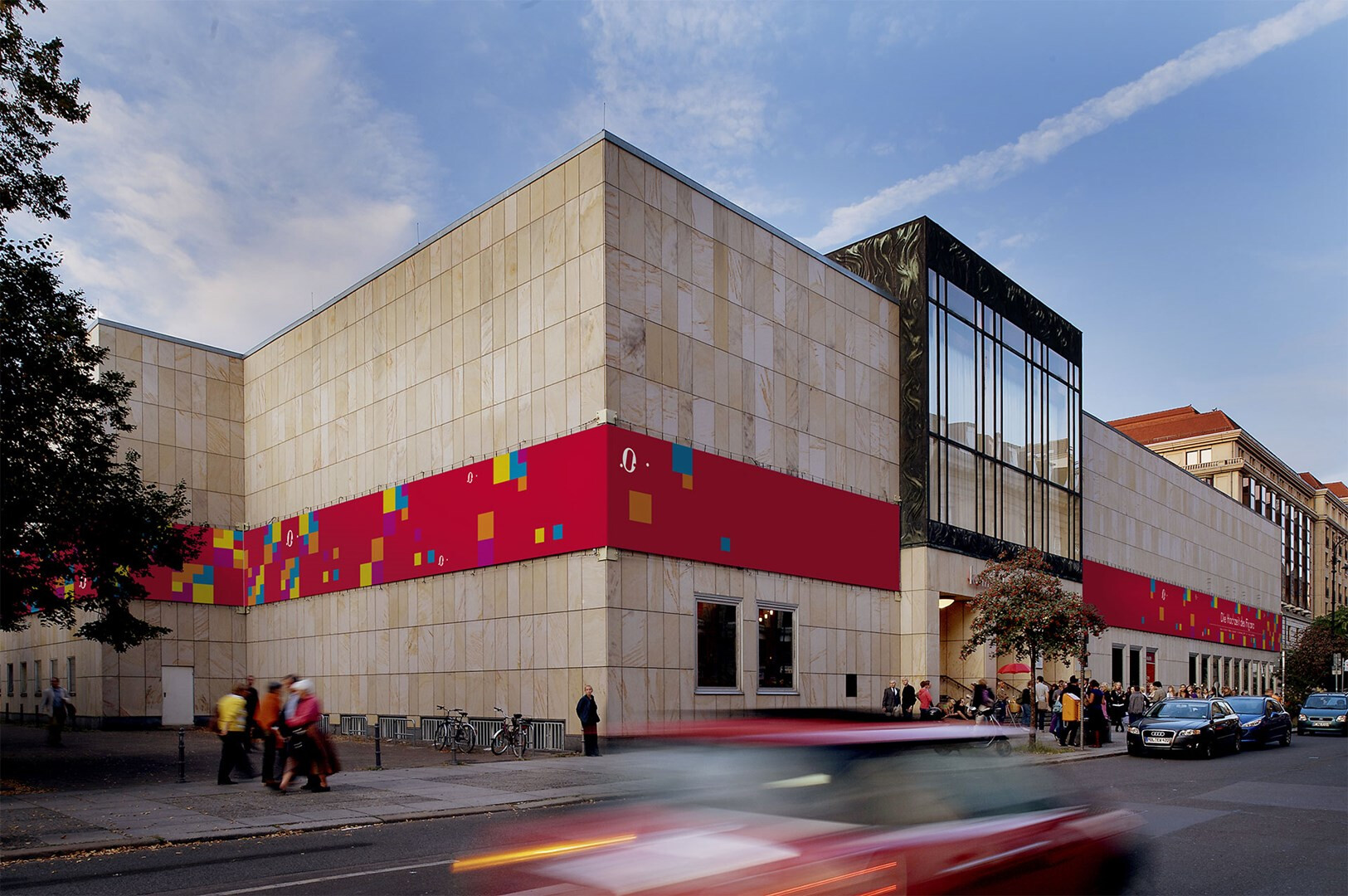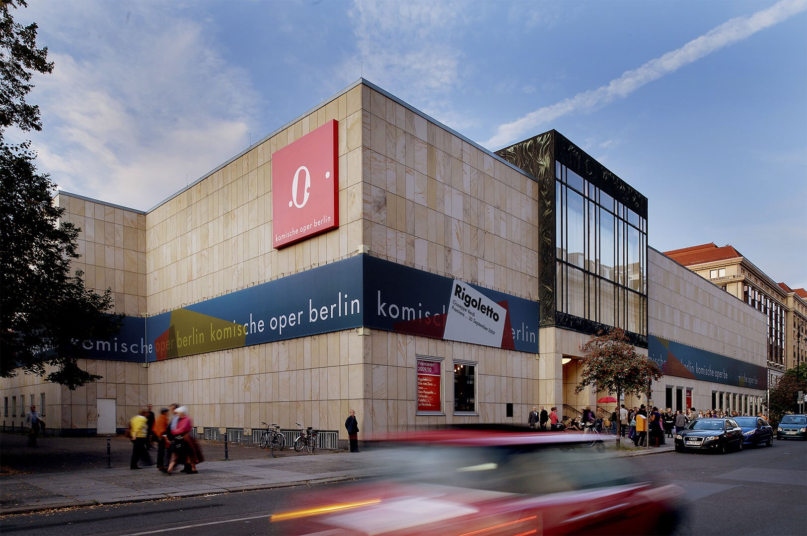 das gebäude der komischen oper berlin ist ein nachkriegskuriosum, zwar unter den linden gelegen, aber mit eingang »hinten« an der behrenstraße. usus konzipiert eine banderole, die die heterogene kubatur des opernhauses zusammenfasst und begreifbar macht. seit der spielzeit 2004/05 wird auf einer gesamtlänge von 250 metern die spielzeit beworben.