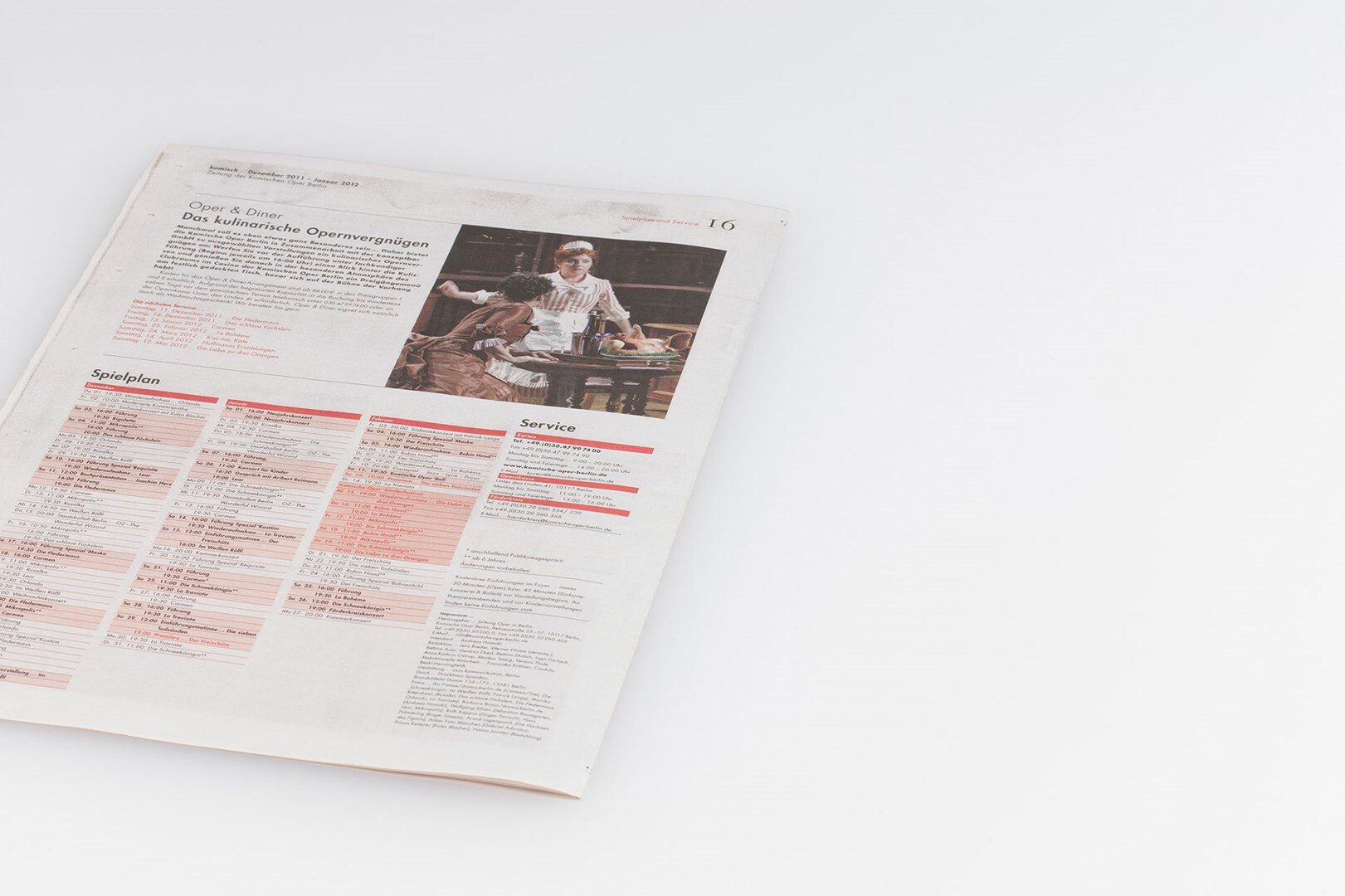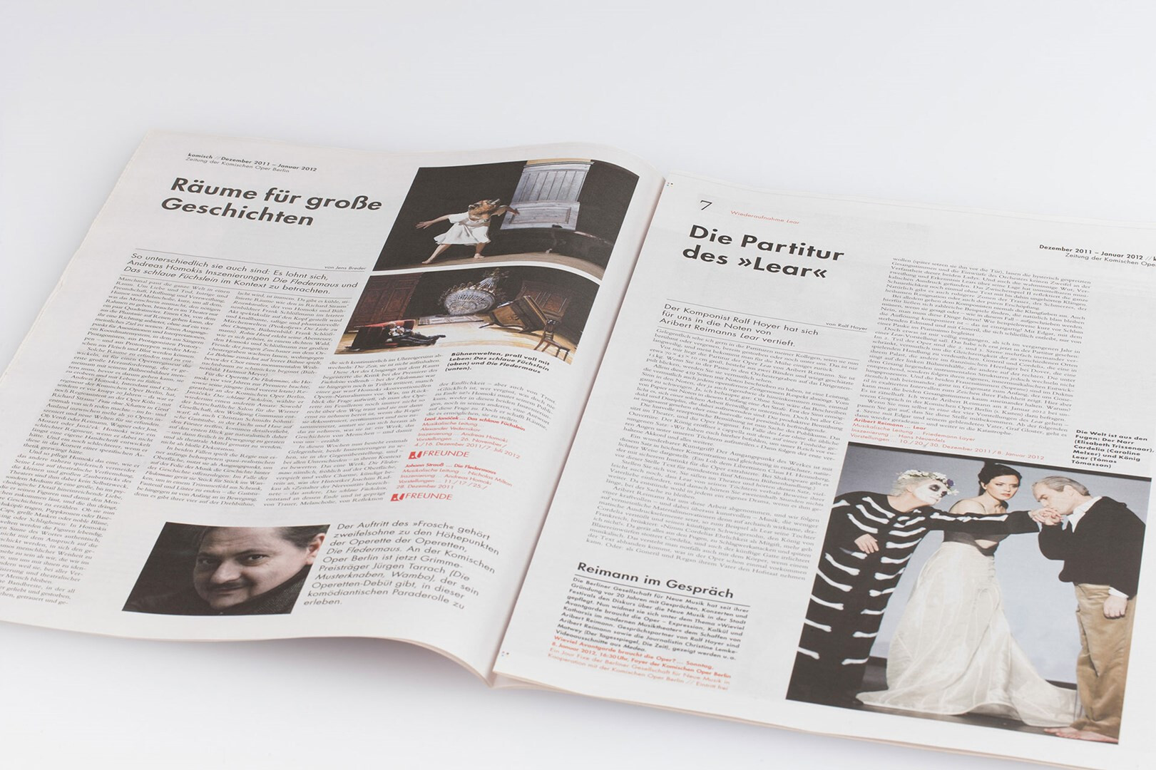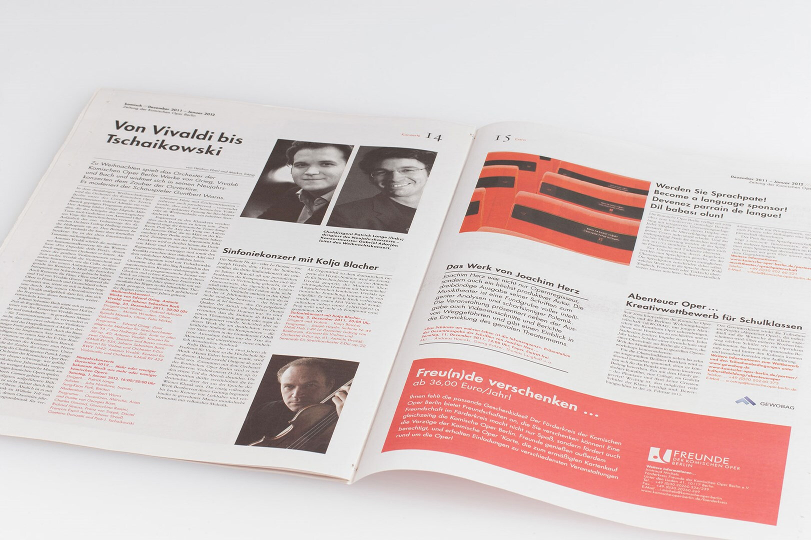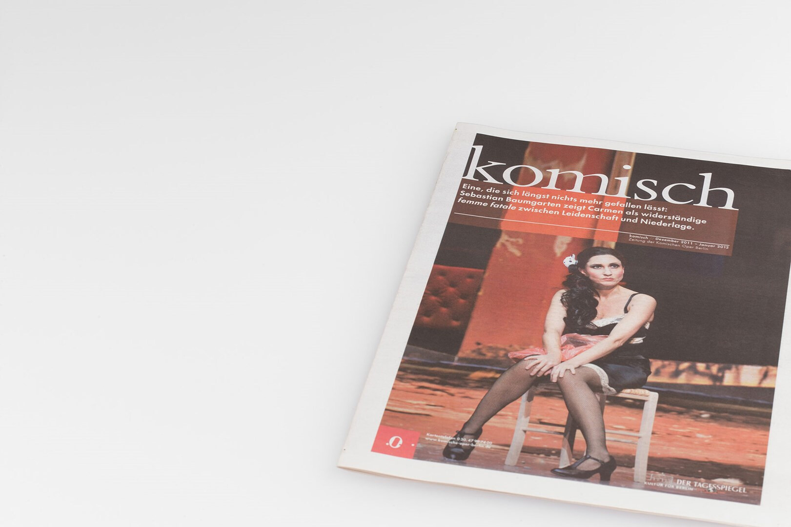 layout der zeitung »komisch«. in der monatlichen zeitung informiert die komische oper berlin ab 2003 über ihr programm und liefert hintergründe zu werken, inszenierungen und künstlern. ab 2008 erscheint die »komisch« zweimonatlich als beileger im berliner tagesspiegel. 2003–12