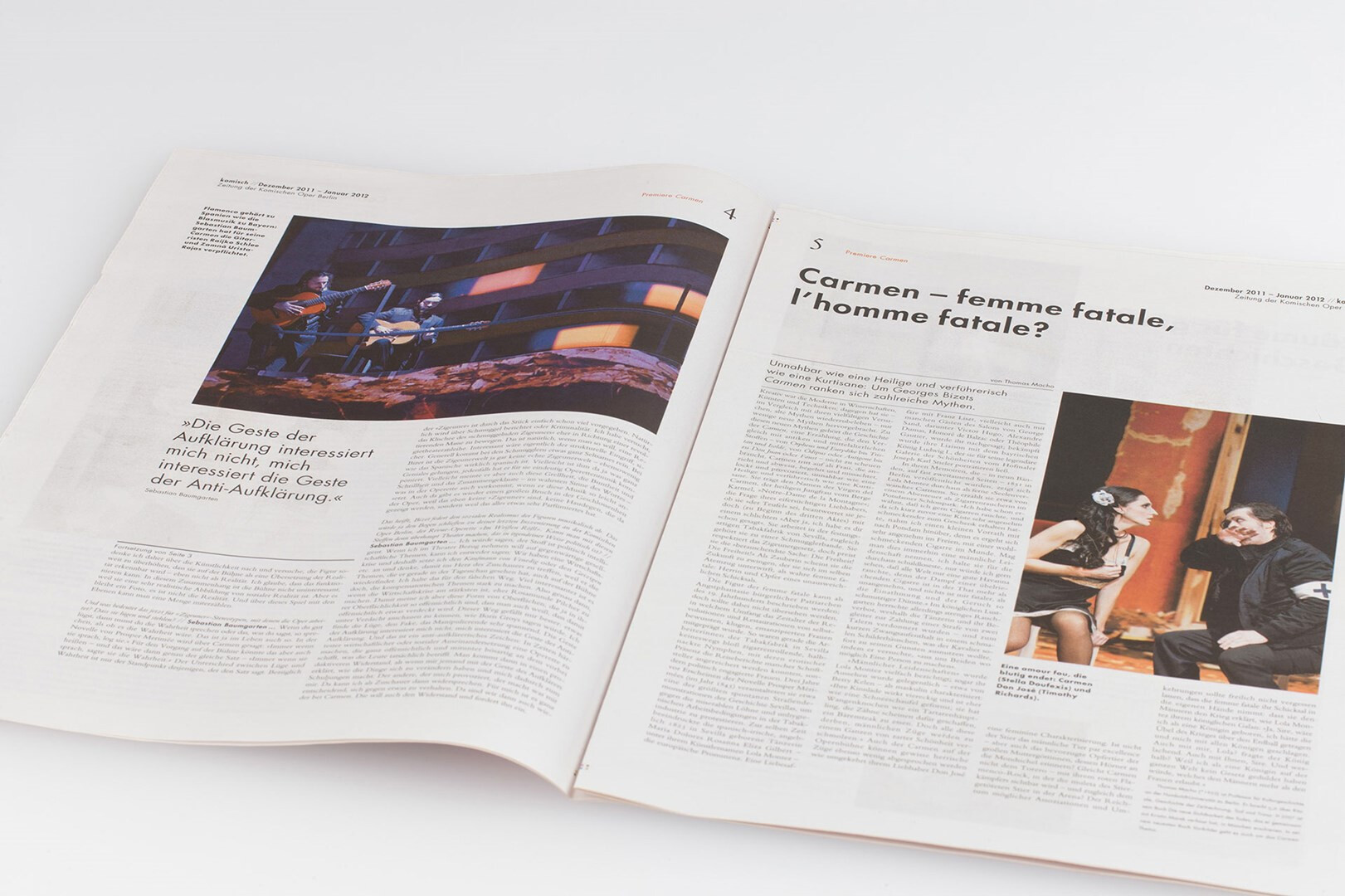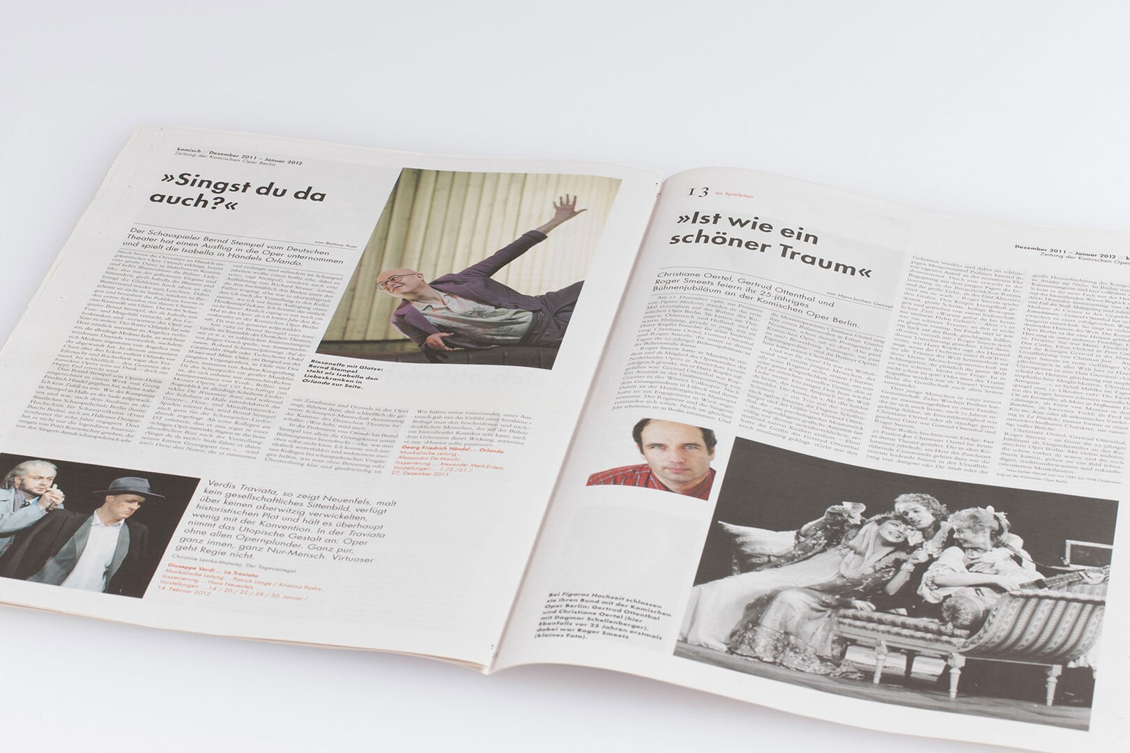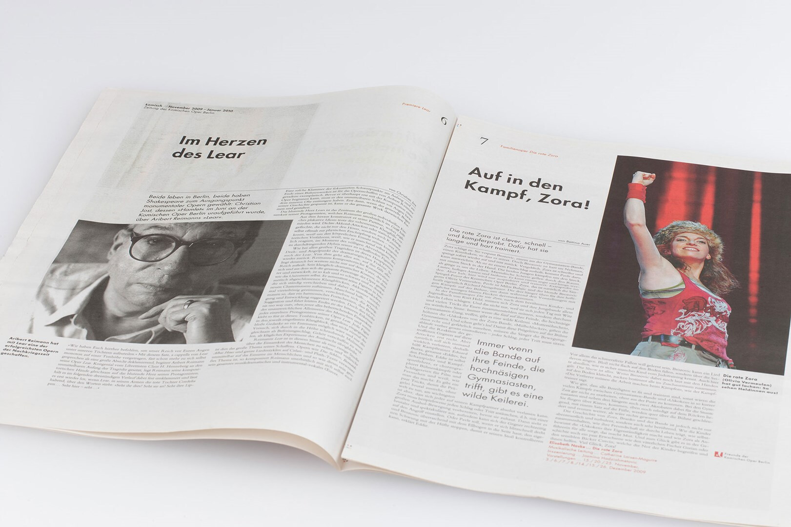 layout der zeitung »komisch«. in der monatlichen zeitung informiert die komische oper berlin ab 2003 über ihr programm und liefert hintergründe zu werken, inszenierungen und künstlern. ab 2008 erscheint die »komisch« zweimonatlich als beileger im berliner tagesspiegel. 2003–12