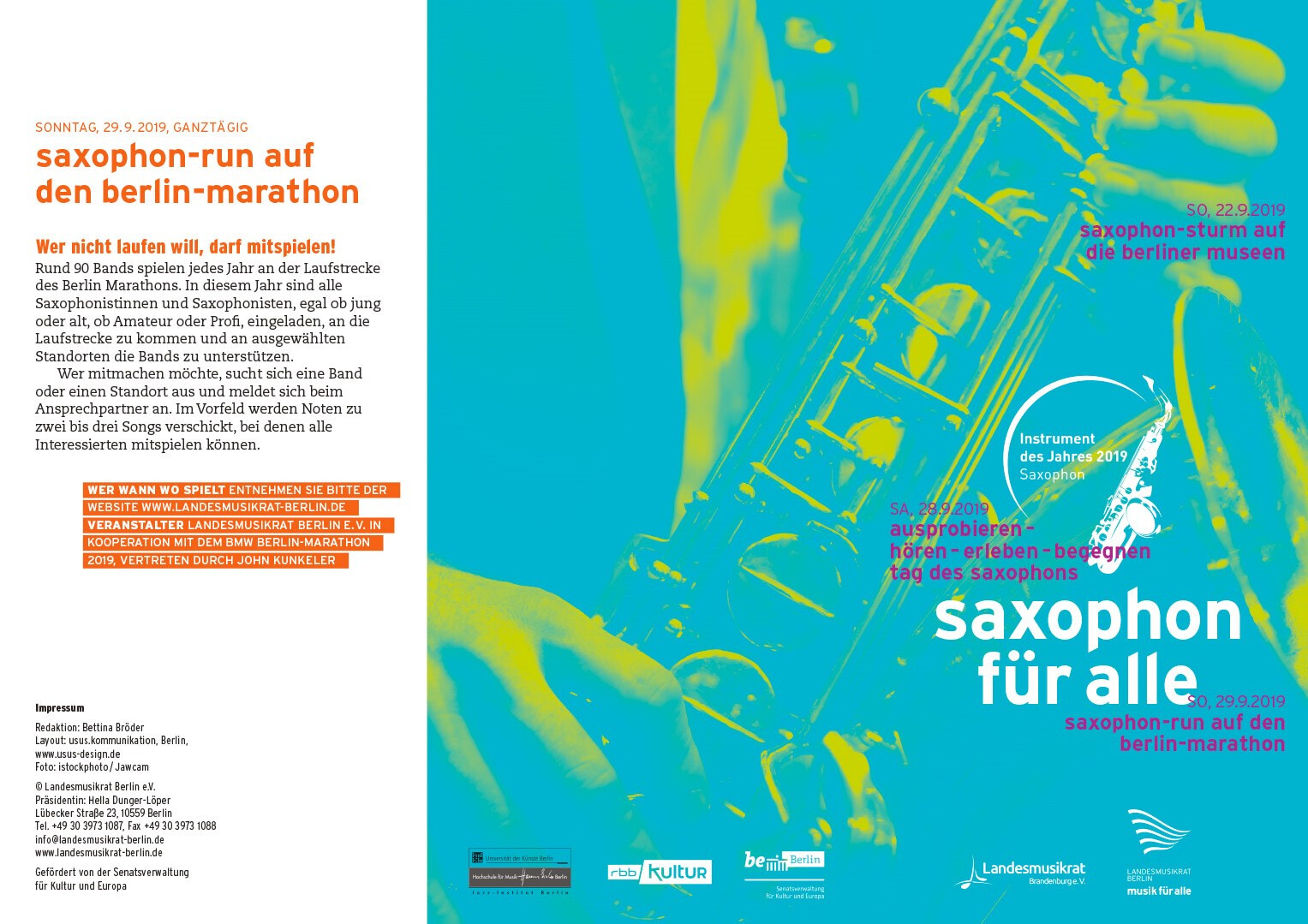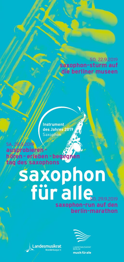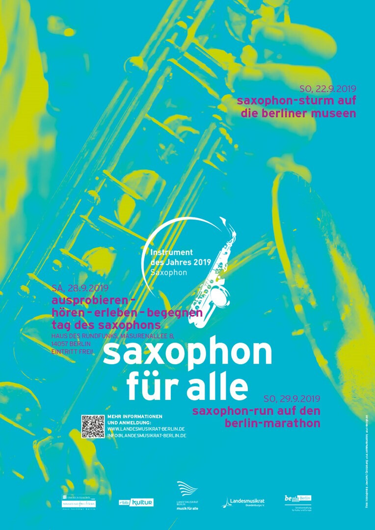 das saxophon ist instrument des jahres 2019. zu diesem anlass lädt der landesmusikrat berlin neben weiteren veranstaltungen zum »tag des saxophons«. im haus des rundfunks bieten konzerte und ausstellungen möglichkeiten zum ausprobieren, lauschen und begegnen, um das saxophon in all seinen facetten zu entdecken. 2019