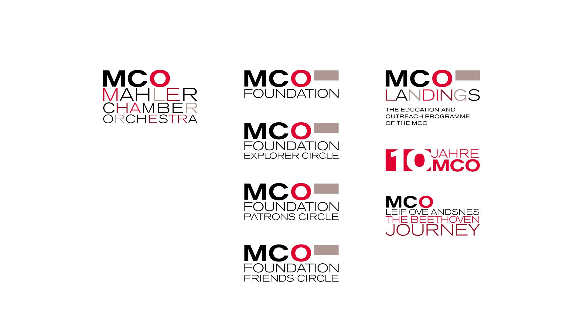 das mco-logo setzt den grundstein für das von usus entwickelte corporate design des mahler chamber orchestra. untergeordnete submarken und signets leiten sich aus der typografischen und farblichen systematik der wortmarke ab. es gilt bei der konzeption das kürzel »mco« als musikalische marke zu etablieren und in der wahrnehmbarkeit zu bevorzugen. denn beim mco handelt es sich nicht um ein (kleines) kammerorchester, was der name glauben machen könnte, sondern eine in den orchestergruppen komplett besetzte einheit. dieser widerspruch soll mit der wortmarke aufgelöst werden. 2007