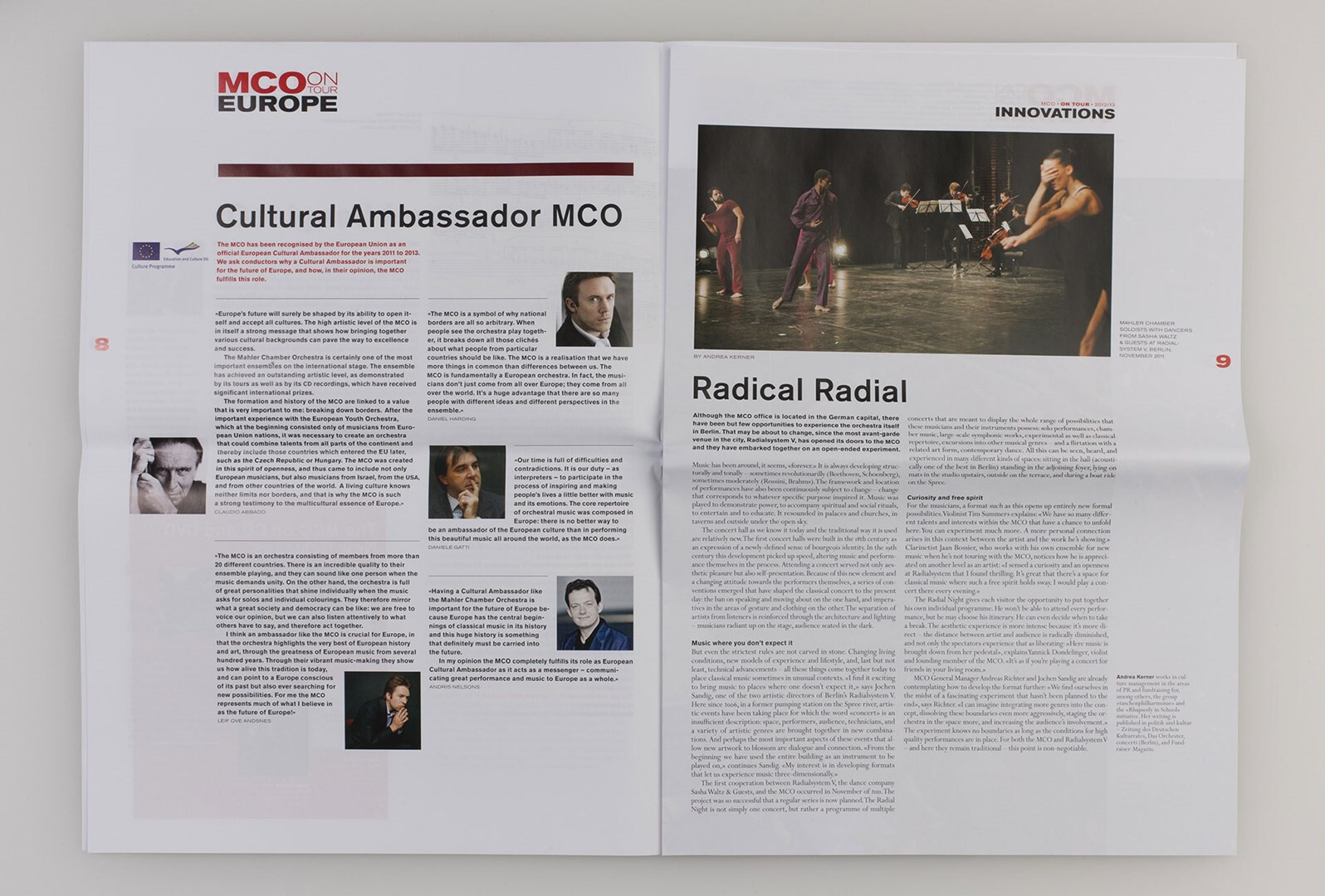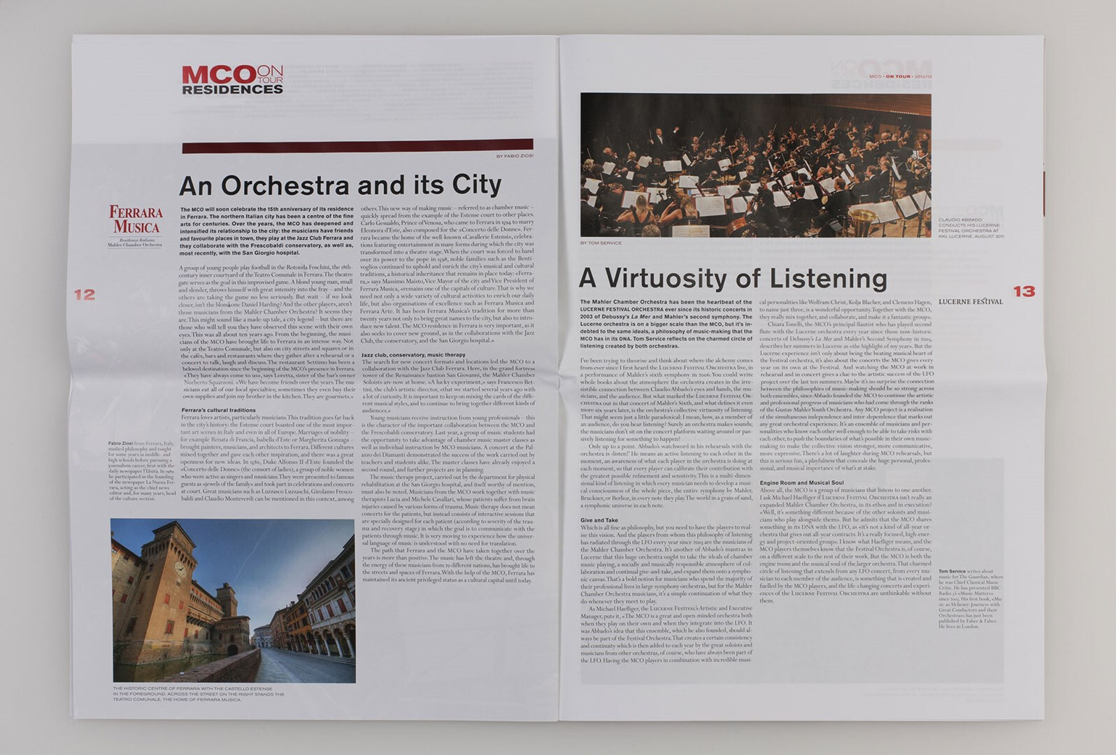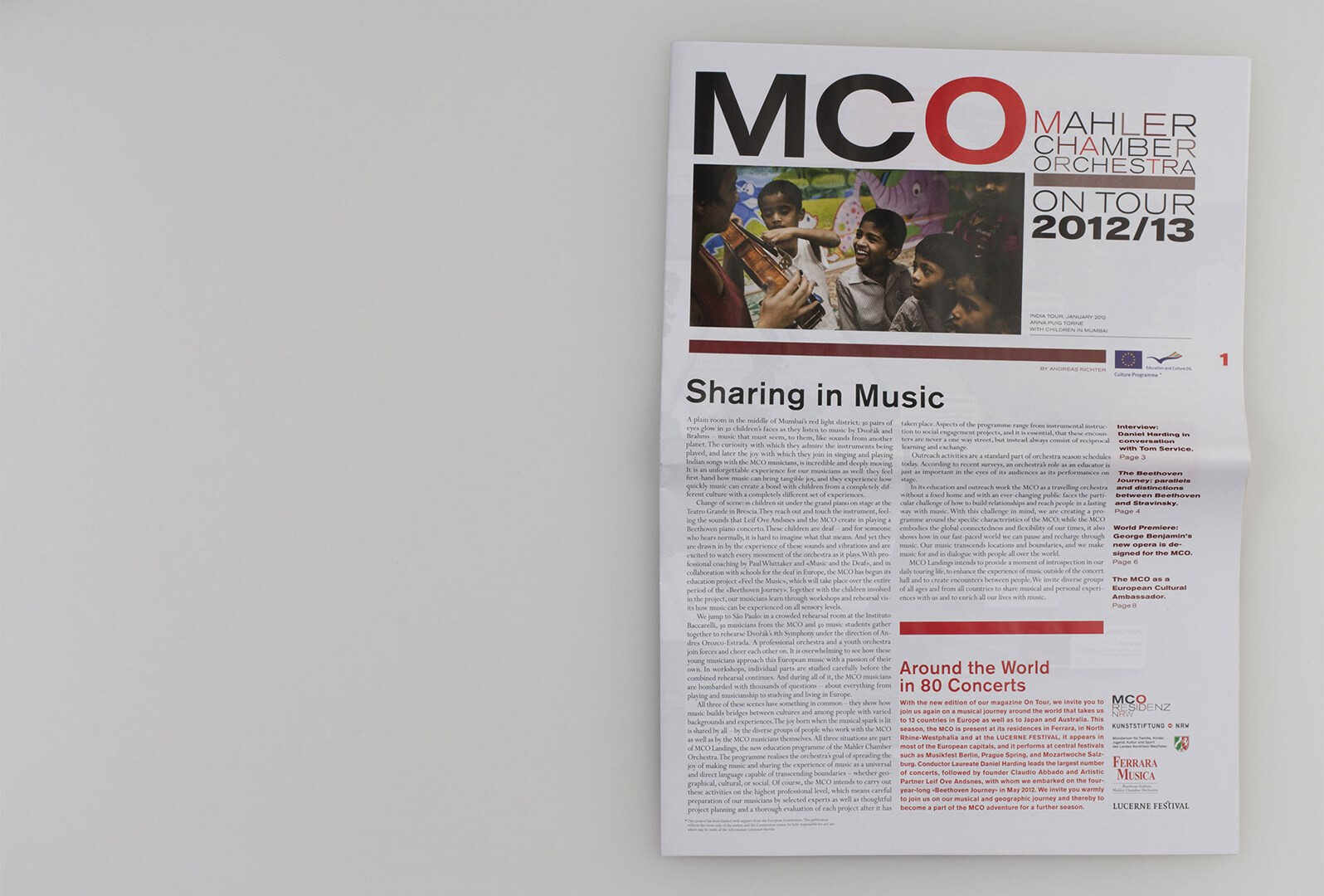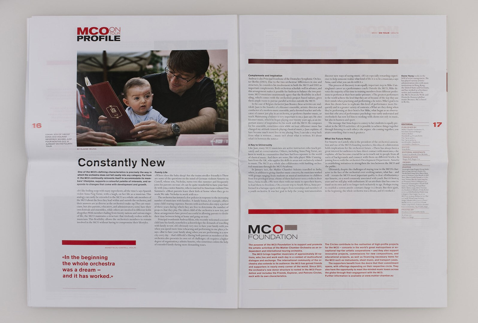 »on tour« heißt das großformatige, mehrsprachige hauptmedium des mahler chamber orchestra, das usus im rahmen des corporate designs konzipiert und von 2007 bis 2013 gestaltet. programm-, musik- und kulturbeiträge, orchester-plaudereien, tour-alltag – das sind die themen, mit denen das mco seinem publikum fernab des orchesterpodiums begegnet. ausgabe saison 2012/13
