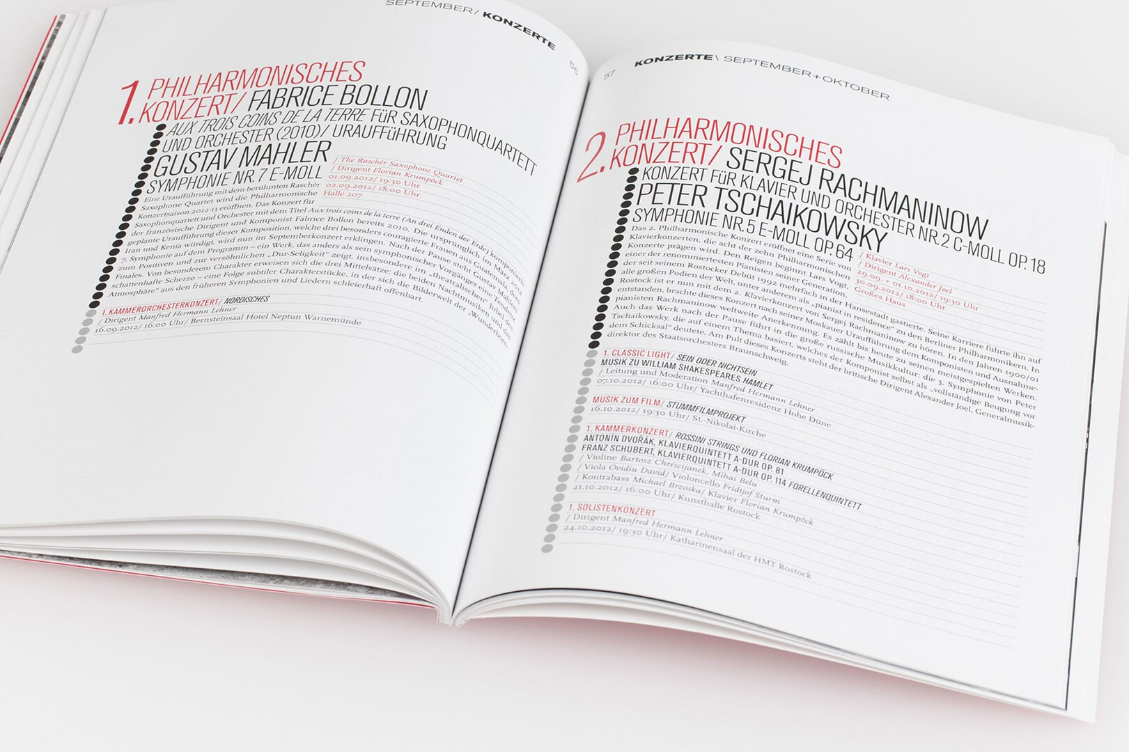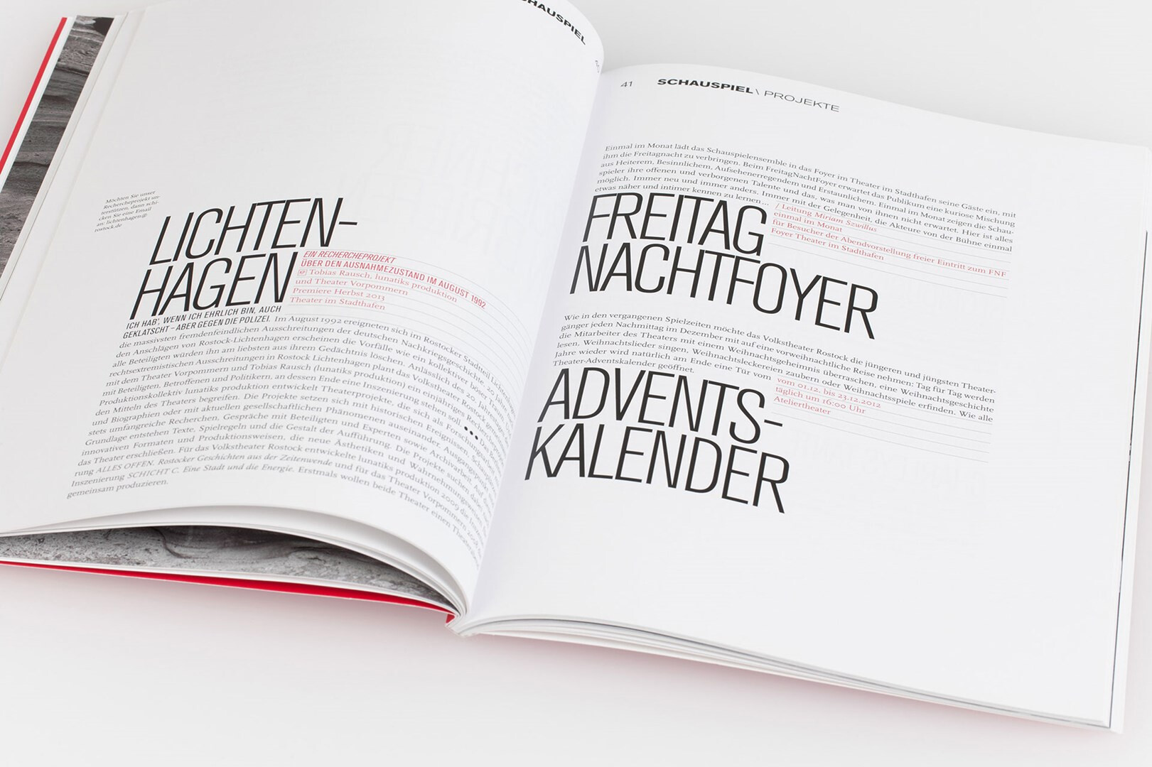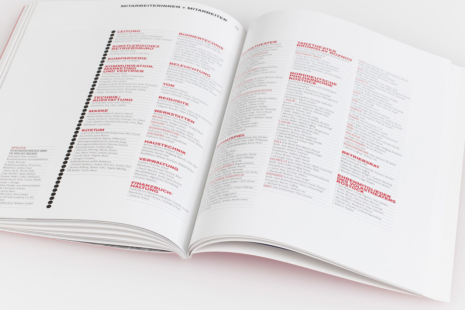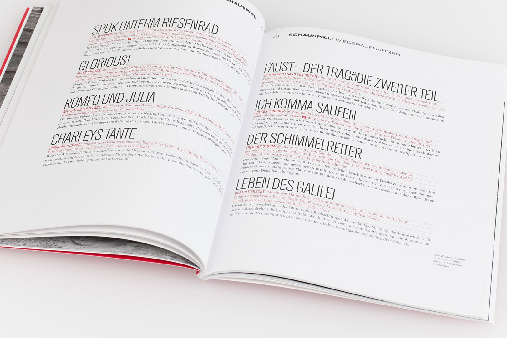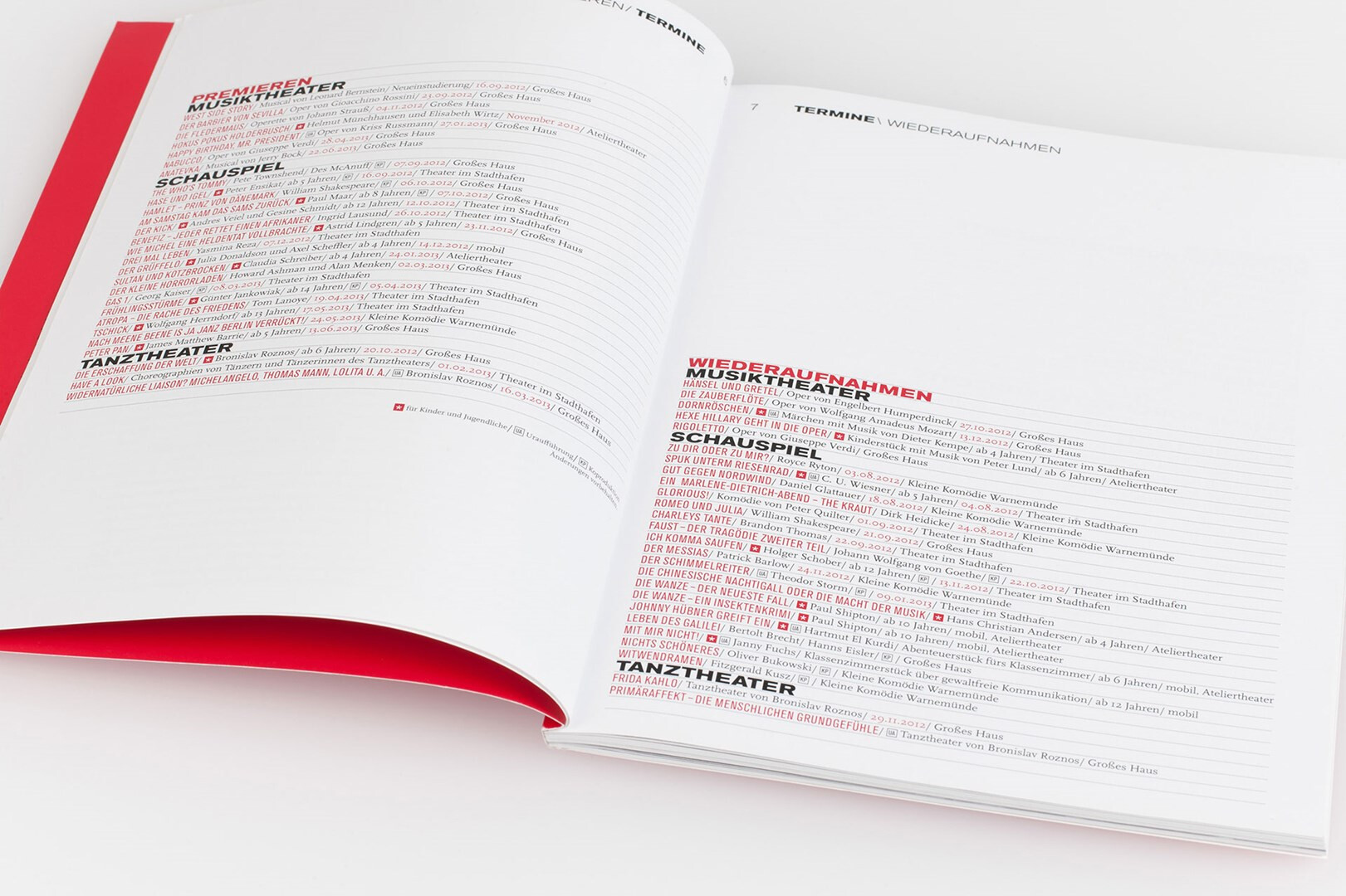 corporate design maßnahme: konzeption und gestaltung des spielzeitheftes zur saison 2012/13. statt verquaster vorabmotive jetzt künstlerisch inszenierte schwarzweiß-fotografie von jaschi klein. viel raum für typografie, klare stilistik, farbe und struktur, die alle auf das konto markenbildung einzahlen. 2012