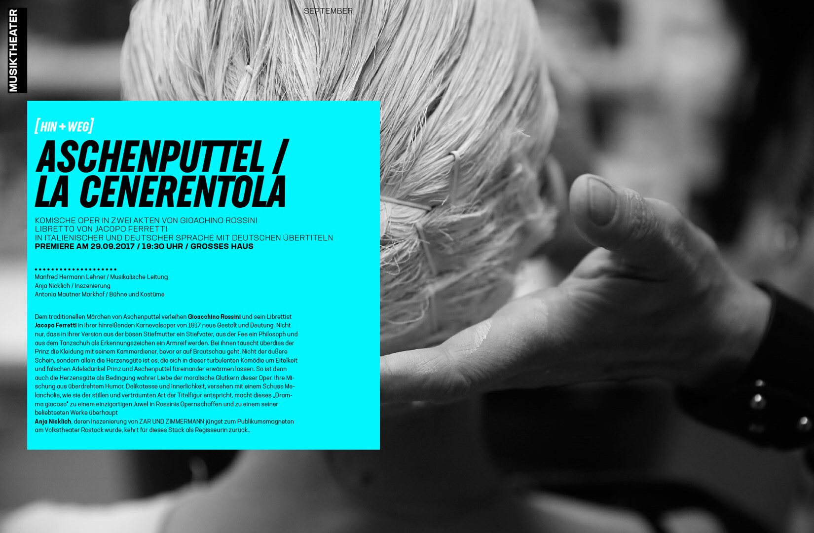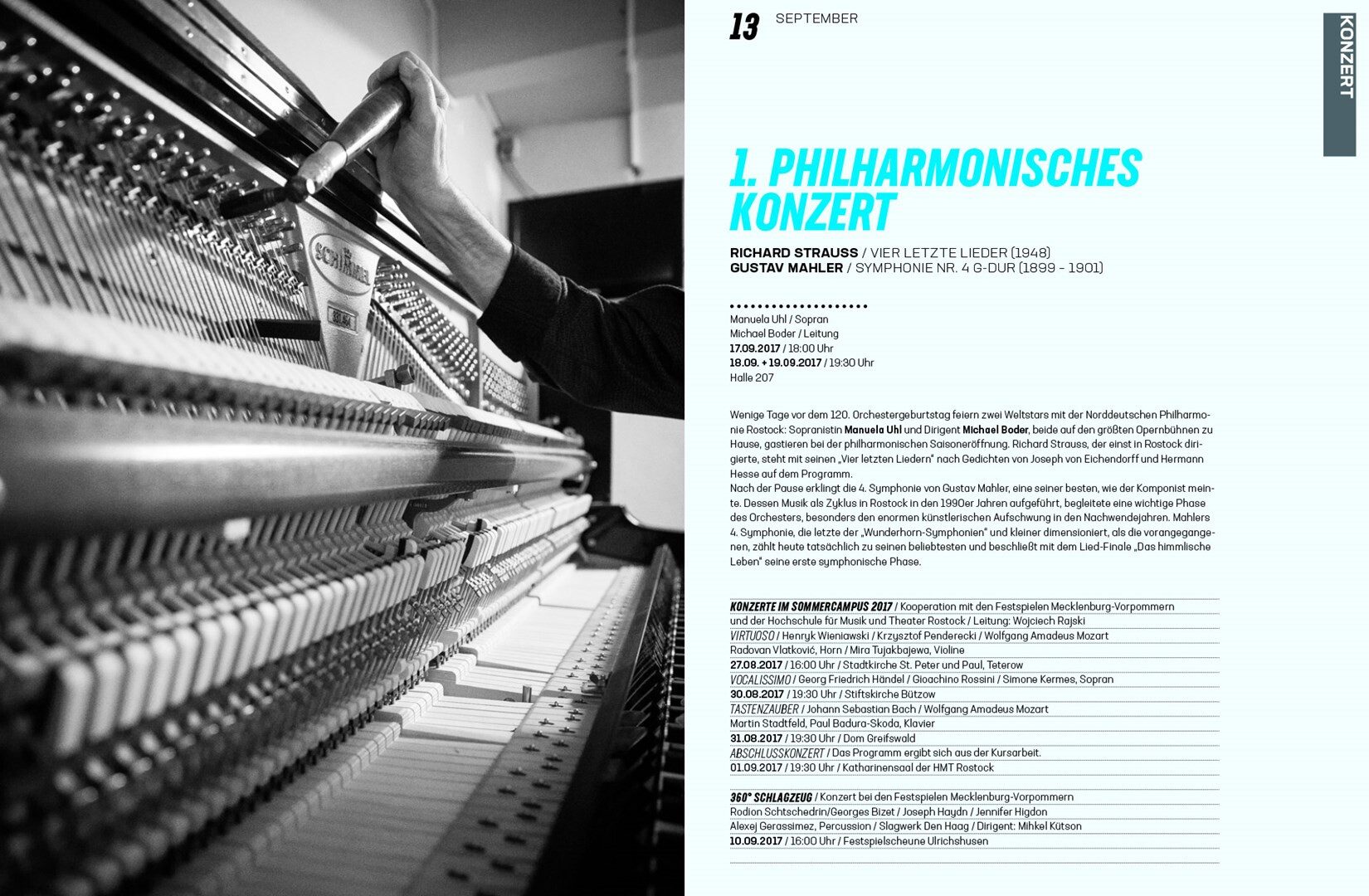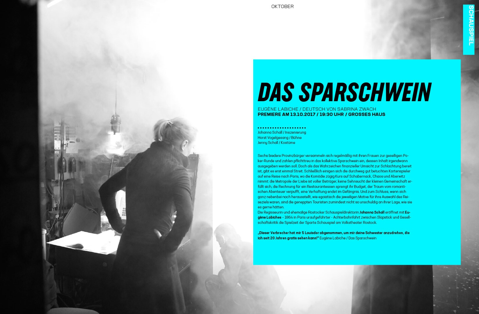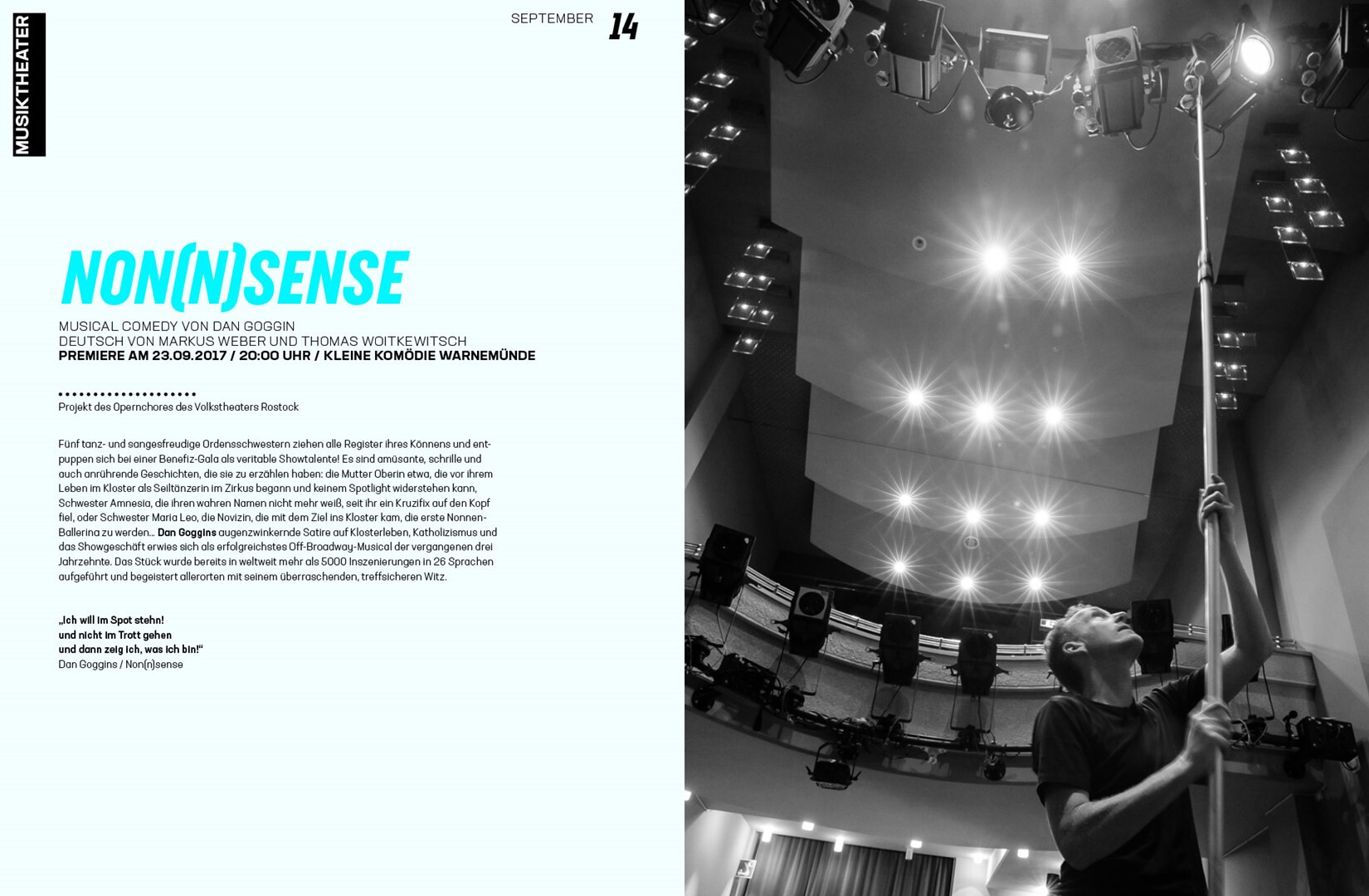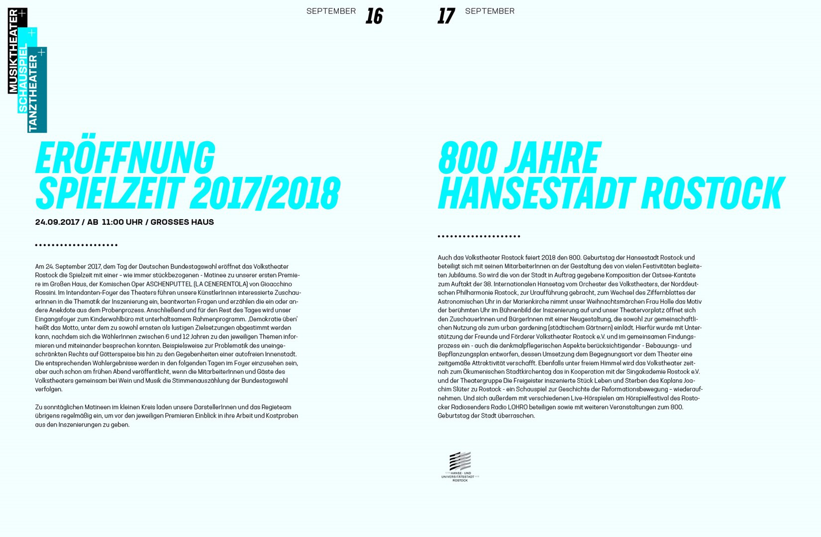 corporate design relaunch: gestaltung des spielzeitheftes zur saison 2017/18. schwarz-weiß-fotos aus dem innenleben des theaters werden von blau und plakativer typografie kontrastiert. im vergleich zum konzept von 2012 kommt alles einfacher daher.