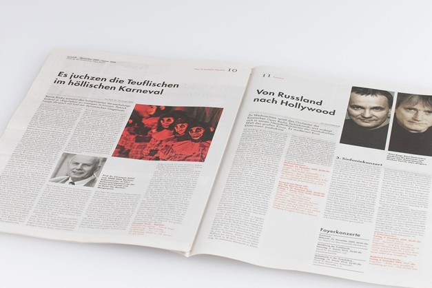 layout der zeitung »komisch«. in der monatlichen zeitung informiert die komische oper berlin ab 2003 über ihr programm und liefert hintergründe zu werken, inszenierungen und künstlern. ab 2008 erscheint die »komisch« zweimonatlich als beileger im berliner tagesspiegel. 2003–12