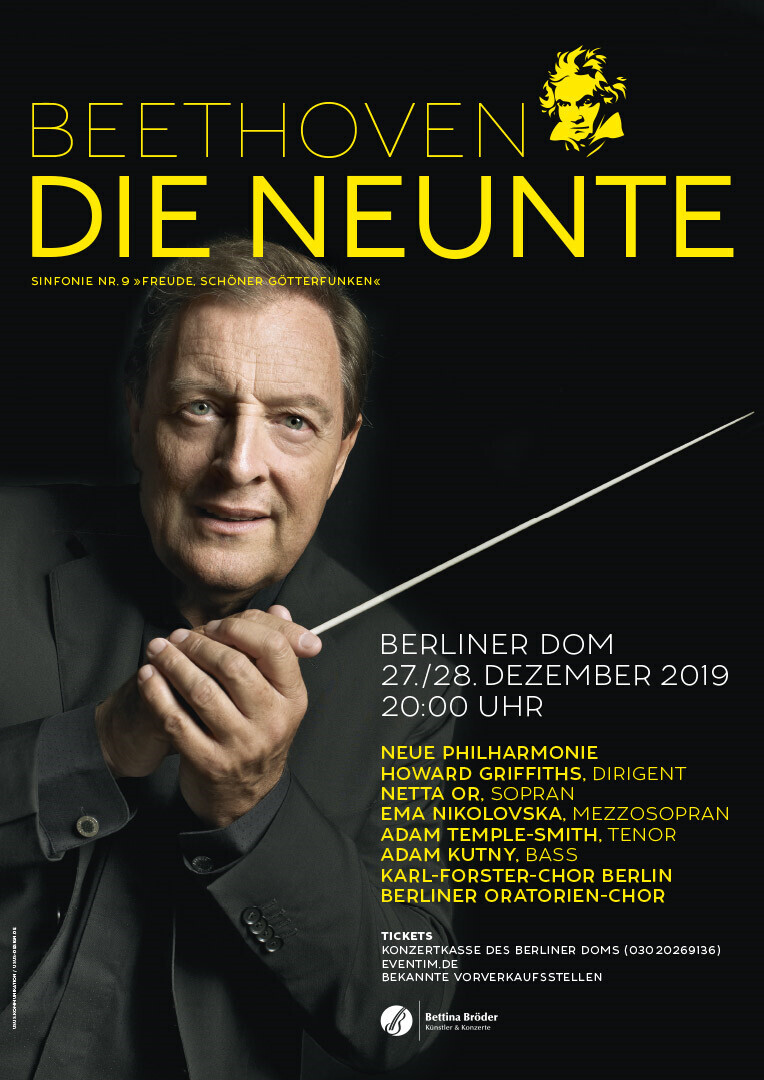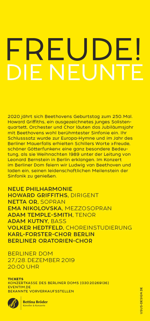 zum auftakt des beethoven-jahres 2020 lädt bettina bröder künstler & konzerte das berliner publikum zur aufführung von beethovens neunter sinfonie in den berliner dom ein. usus übernimmt kurzfristig die gestaltung von plakaten und flyer. 2019