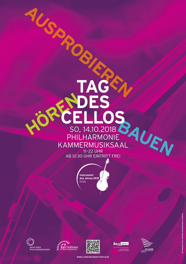 der landesmusikrat berlin ruft zum »tag des cellos« im kammermusiksaal der berliner philharmonie auf. zum »instrument des jahres 2018« gibt es angebote für jung und alt zum zuhören und lernen, klangbeispiele vom barock bis jazz sowie gelegenheiten zum eigenem ausprobieren. 2018