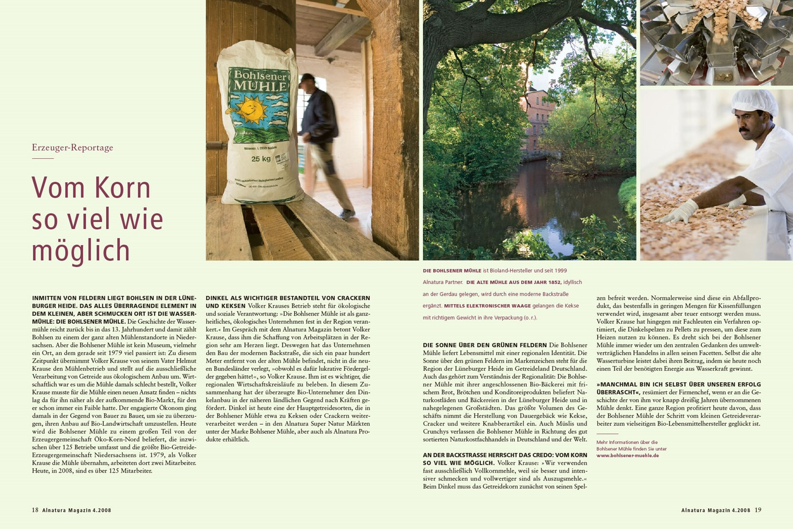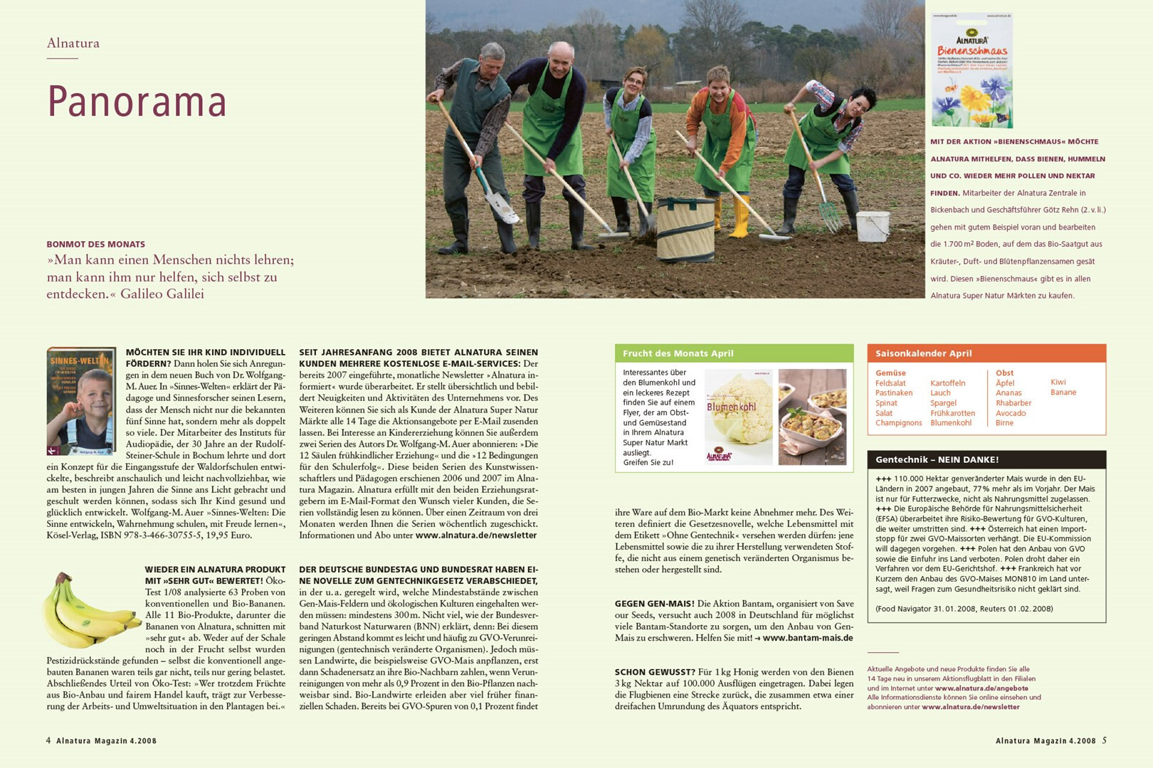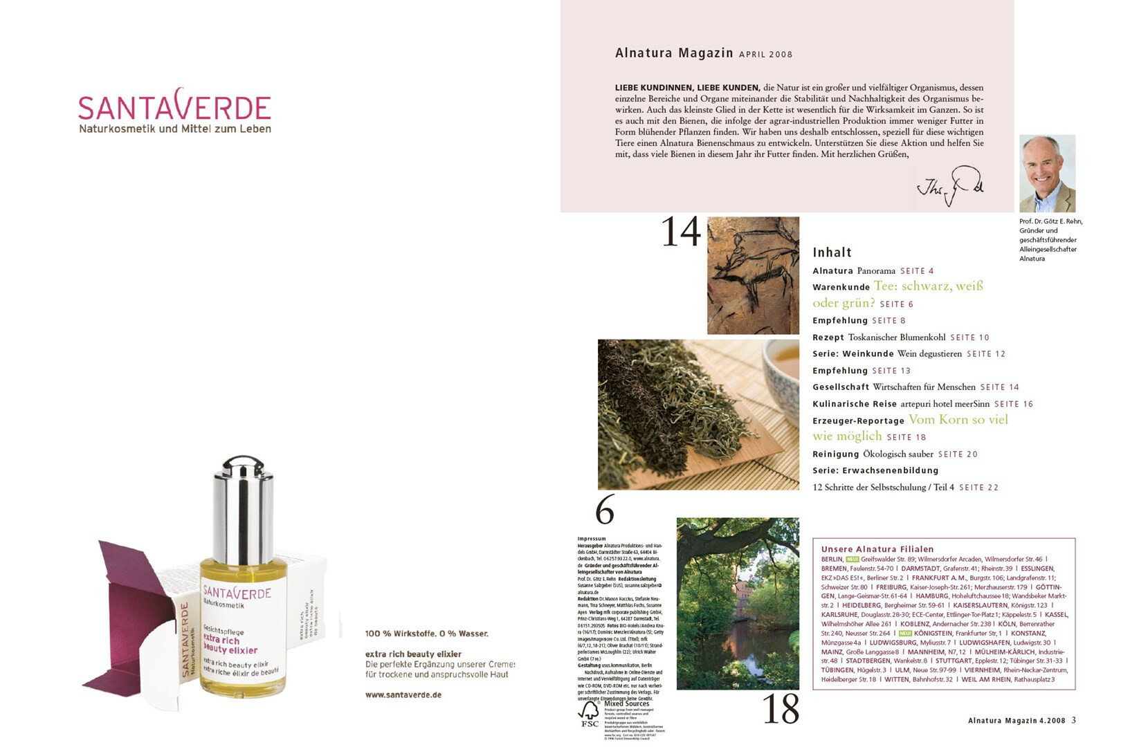 relaunch des alnatura corporate-magazins, ausgabe april 2008. usus verleiht dem kundenmagazin ab jahrgang 2008 ein neues gesicht. auf 24 seiten finden sich aktuelle angebote und redaktionelle beiträge mit einblicken in das unternehmen sowie zu gesellschaftlich relevanten themen. verlag und redaktion: mfk corporate publishing gmbh, darmstadt