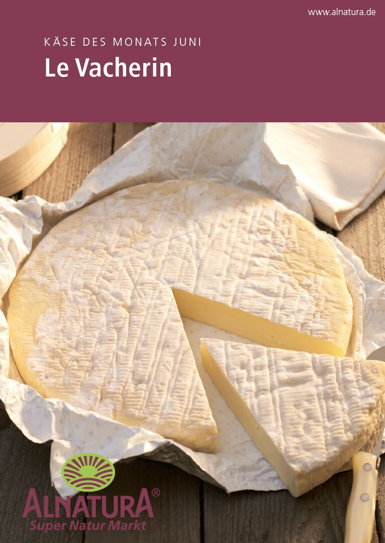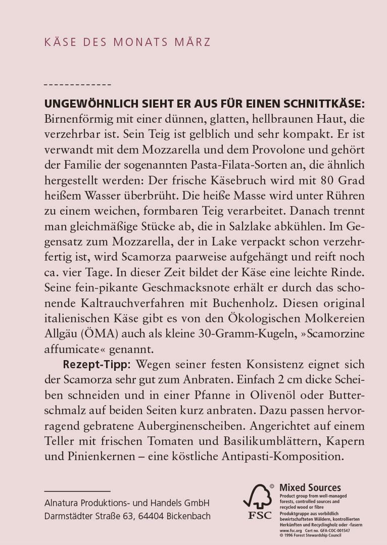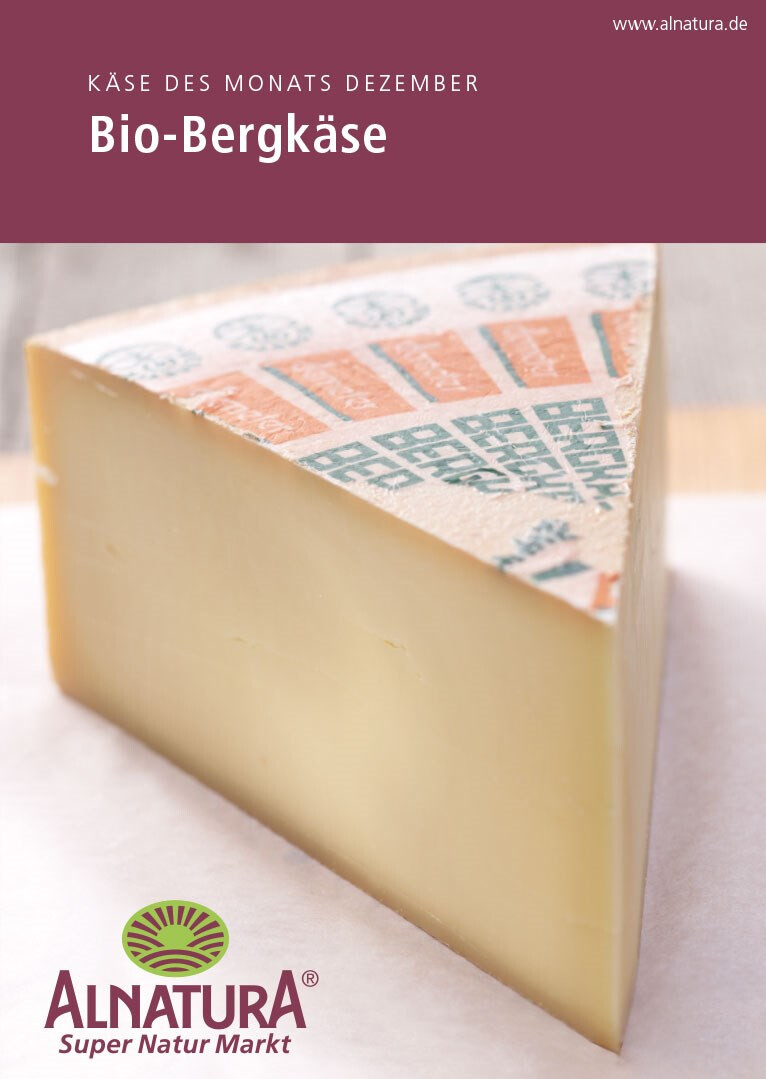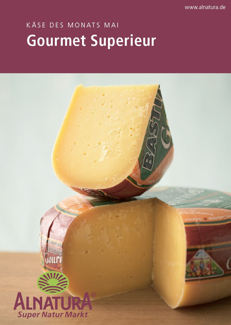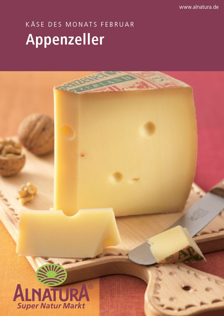 beileger-gestaltung im rahmen des layouts des alnatura magazins. die 4-seitigen flyer »käse des monats« mit kompakten informationen und passender wein-empfehlung liegen den monatlichen magazinausgaben bei. verlag und redaktion: mfk corporate publishing gmbh, darmstadt. 2009