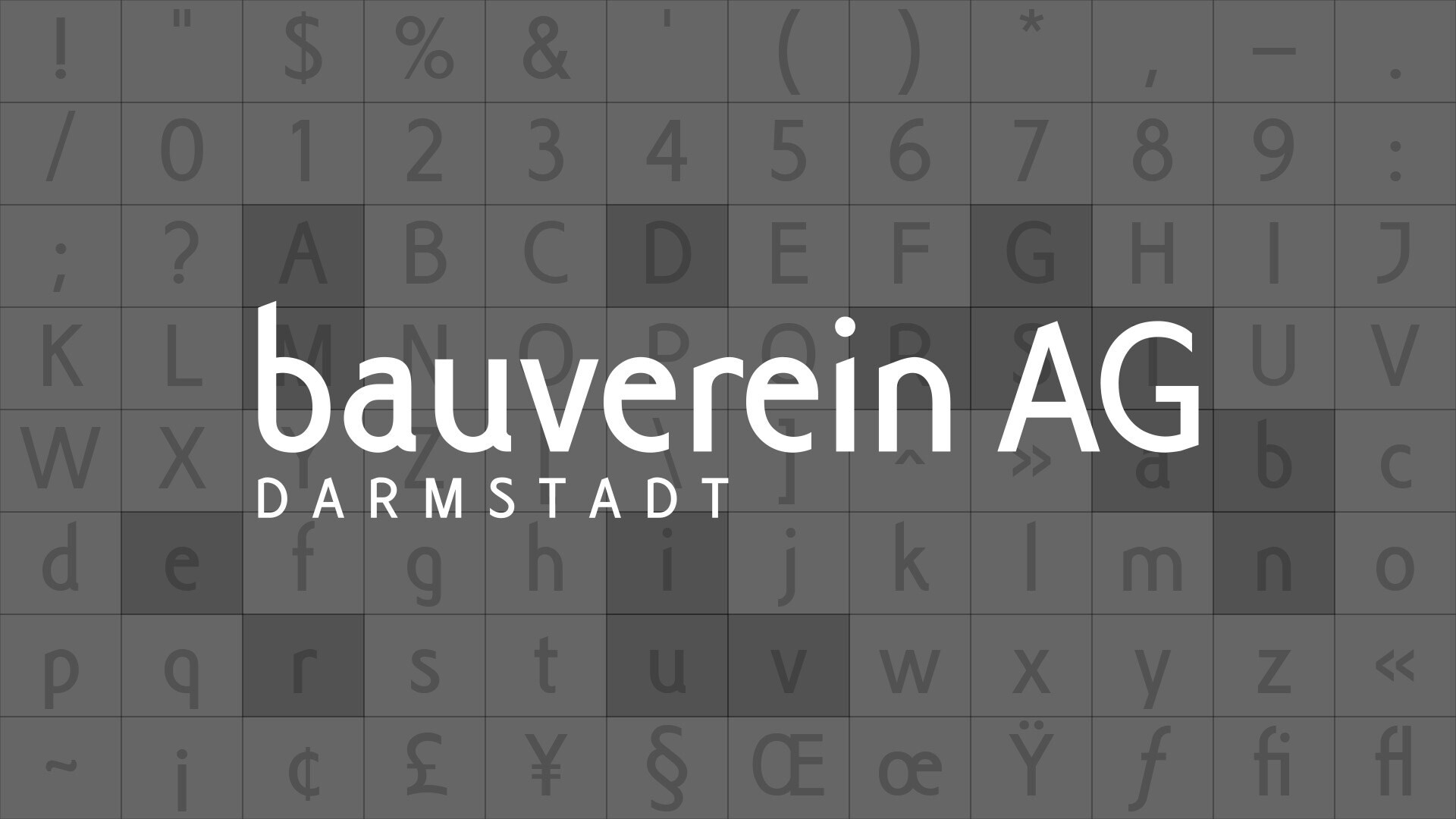 im zuge des neuen corporate designs der bauverein ag entwickelt fabian nicolay 1994 eine schrifttype, die das jugendstilerbe der stadt darmstadt in moderat-sachlicher form aufgreift. mit der von usus gestalteten wortmarke präsentiert sich die bauverein ag als städtisches immobilien-unternehmen vor dem hintergrund von kunsttradition und modernität. dieser wortmarke soll 2008 ein neues logo beigestellt werden. usus nimmt an einem ideenwettbewerb teil.
