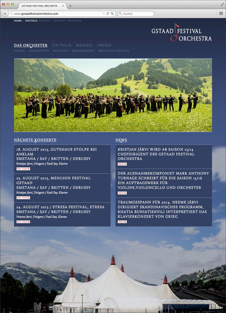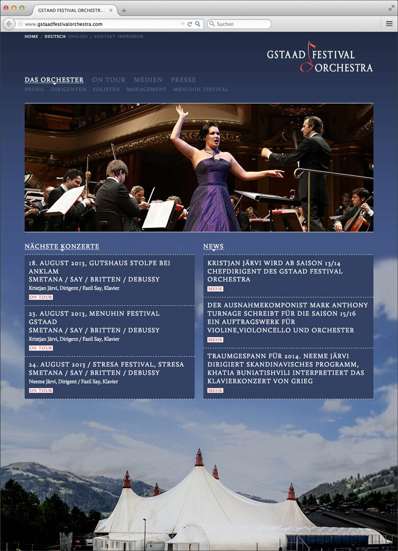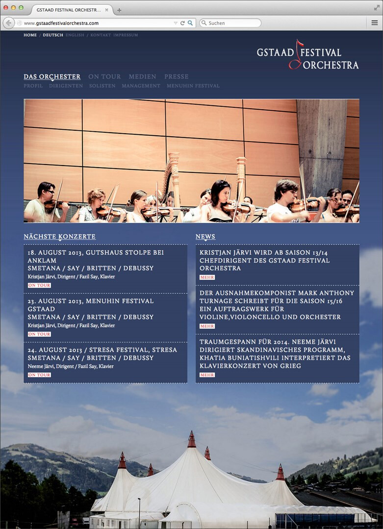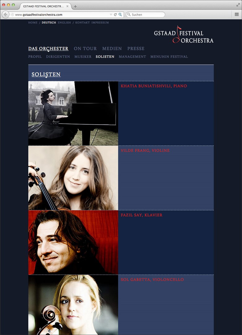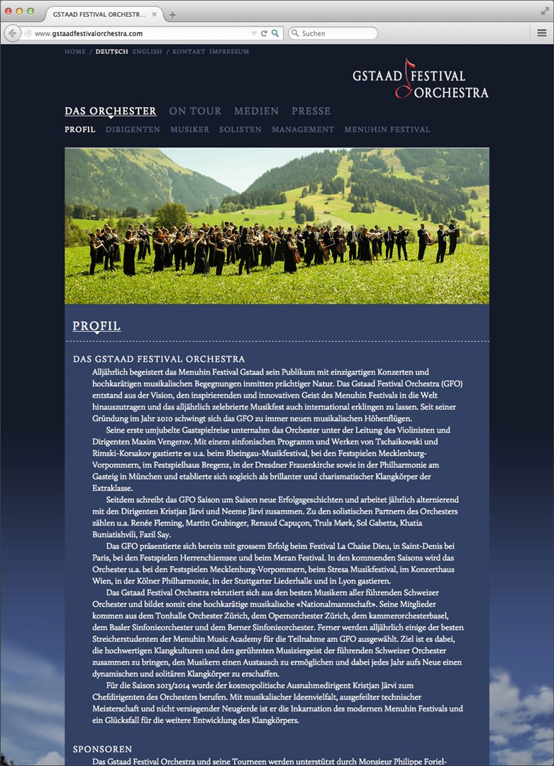 website für das gstaad festival orchestra. neue fotos von wolfgang silveri, neue sortierung der inhalte, wordpress-module, volle responsivität, mobil kompatibel. das sind die vorgaben des orchesters für den website-relaunch. leider nur von kurzer dauer. programmierung: arme irre, berlin. 2012–15