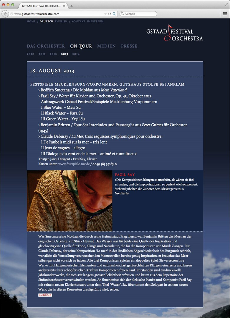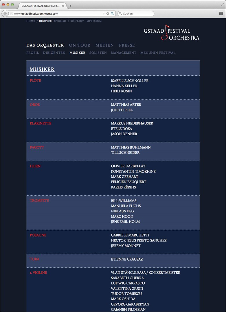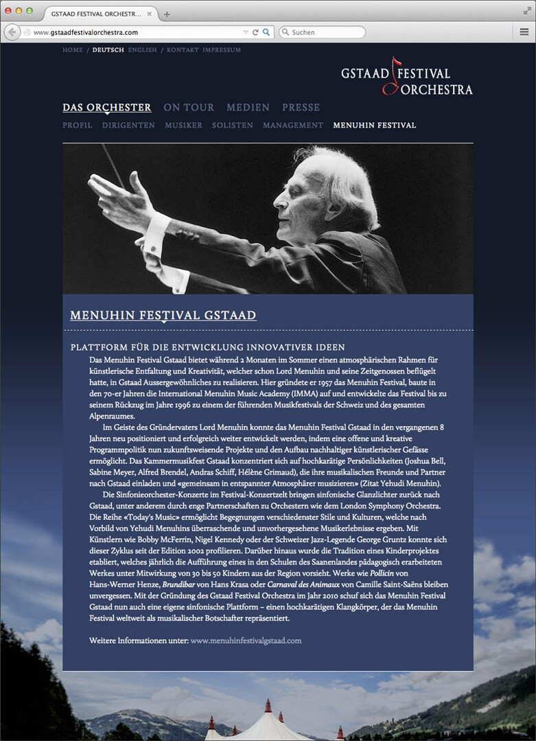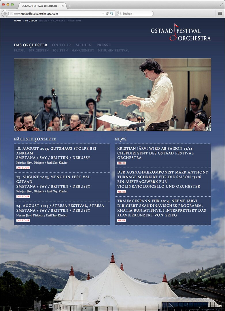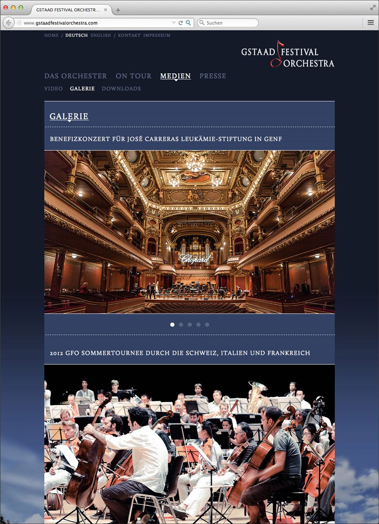 website für das gstaad festival orchestra. neue fotos von wolfgang silveri, neue sortierung der inhalte, wordpress-module, volle responsivität, mobil kompatibel. das sind die vorgaben des orchesters für den website-relaunch. leider nur von kurzer dauer. programmierung: arme irre, berlin. 2012–15