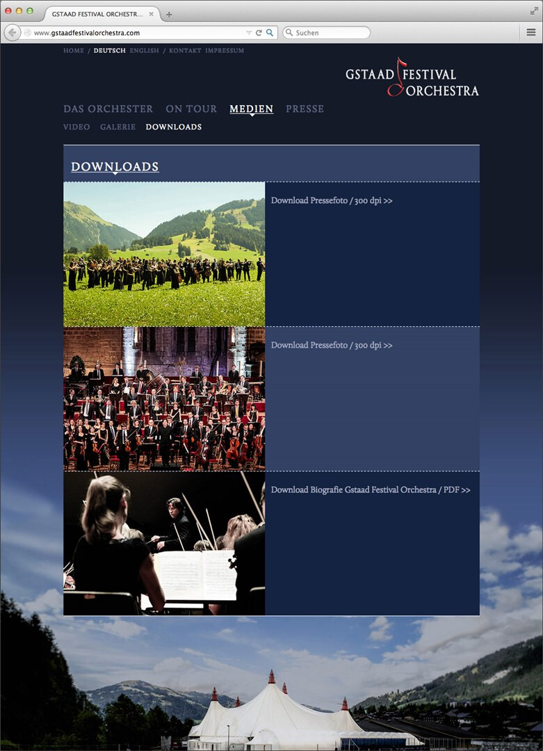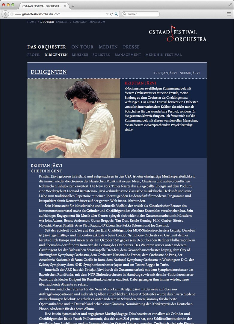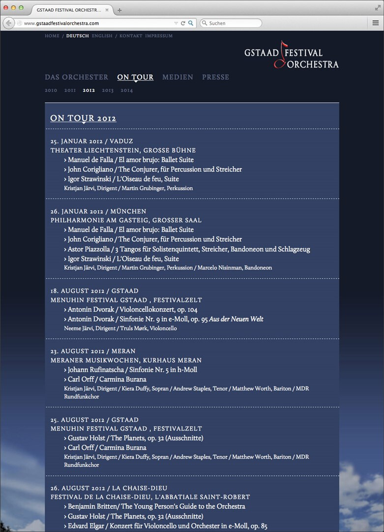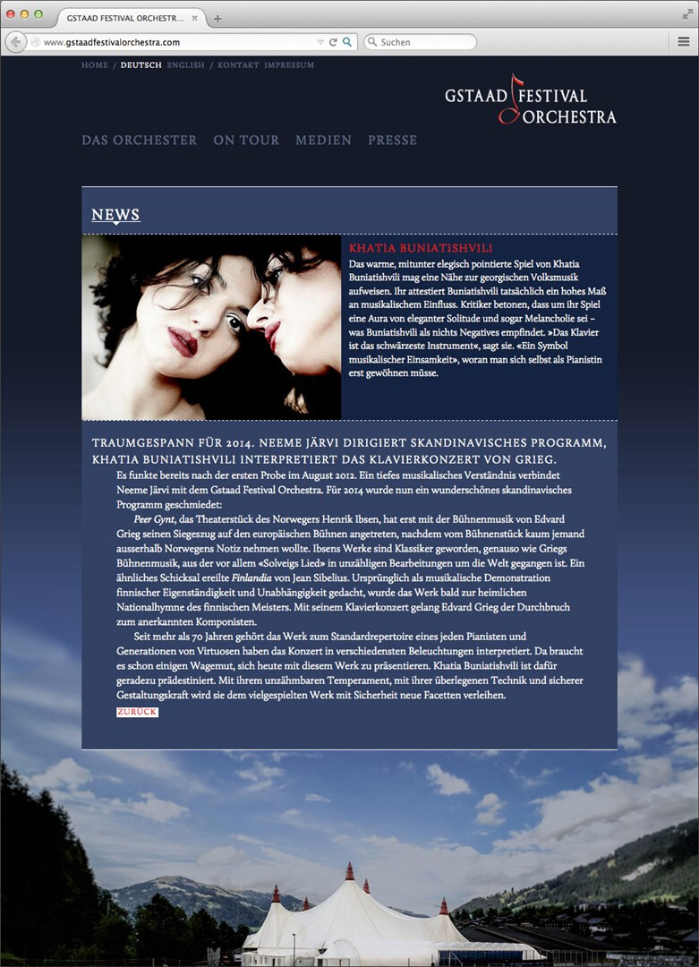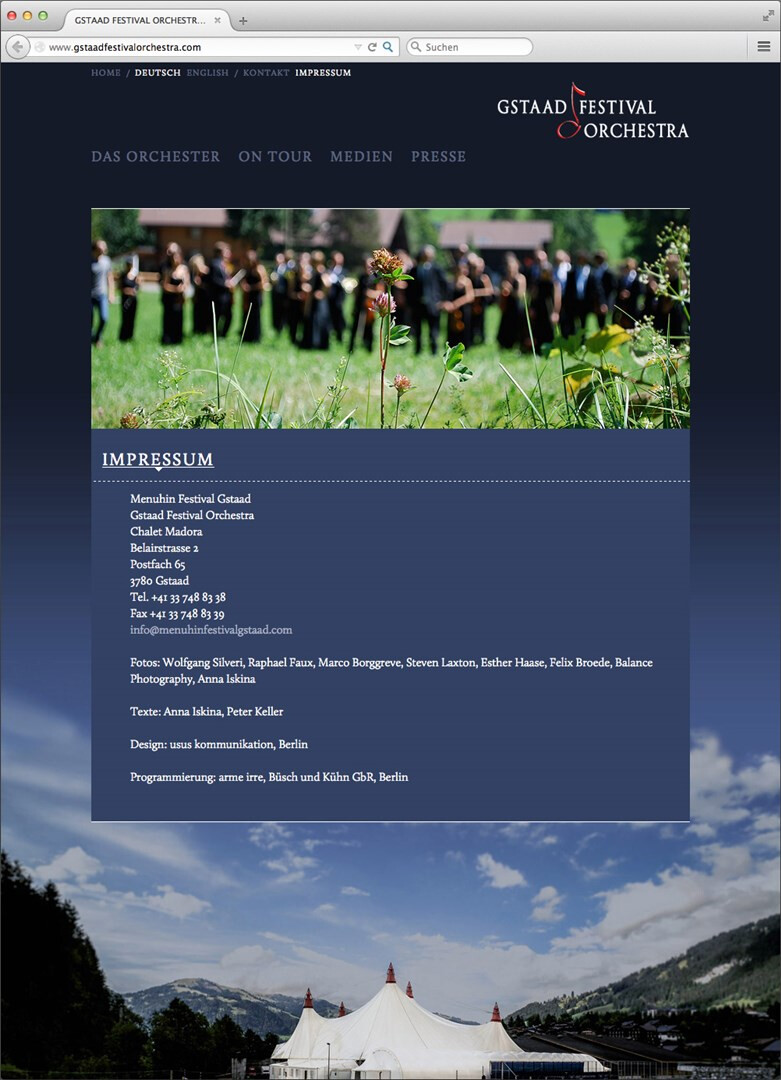 website für das gstaad festival orchestra. neue fotos von wolfgang silveri, neue sortierung der inhalte, wordpress-module, volle responsivität, mobil kompatibel. das sind die vorgaben des orchesters für den website-relaunch. leider nur von kurzer dauer. programmierung: arme irre, berlin. 2012–15