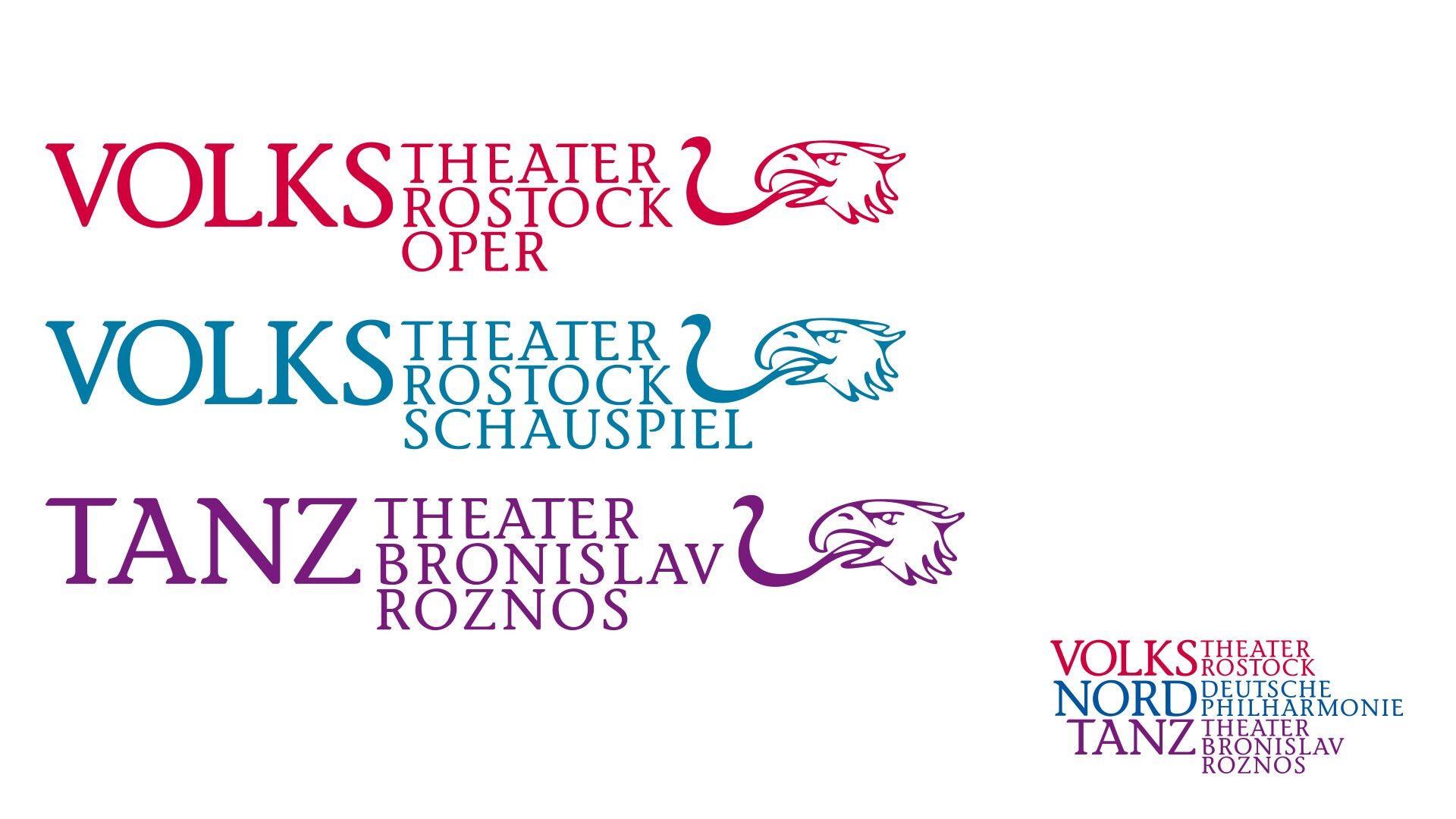 corporate design maßnahme: dem neuen logo steht eine heraldische idee voran. der greifkopf mit der frechen zunge ist dem stadtwappen rostocks entlehnt und soll ein provokanter aufmerksamkeits-magnet für alle sein, die sich angesprochen fühlen. selbstbewusstsein in vignettenform. das passt zum »volkstheater«, finden auch die auftraggeber. allein die tatsache, dass ein neubau geplant ist, verhindert, dass der greifkopf sofort zum volkstheater-logo wird. als zwischenlösung wird die wortmarke vorgezogen. ein intendantenwechsel hat inzwischen dafür gesorgt, dass auch der greif in zukunft nicht das neue volkstheater schmücken wird. die rausgestreckte zunge finden wir trotzdem irgendwie angebracht. 2014